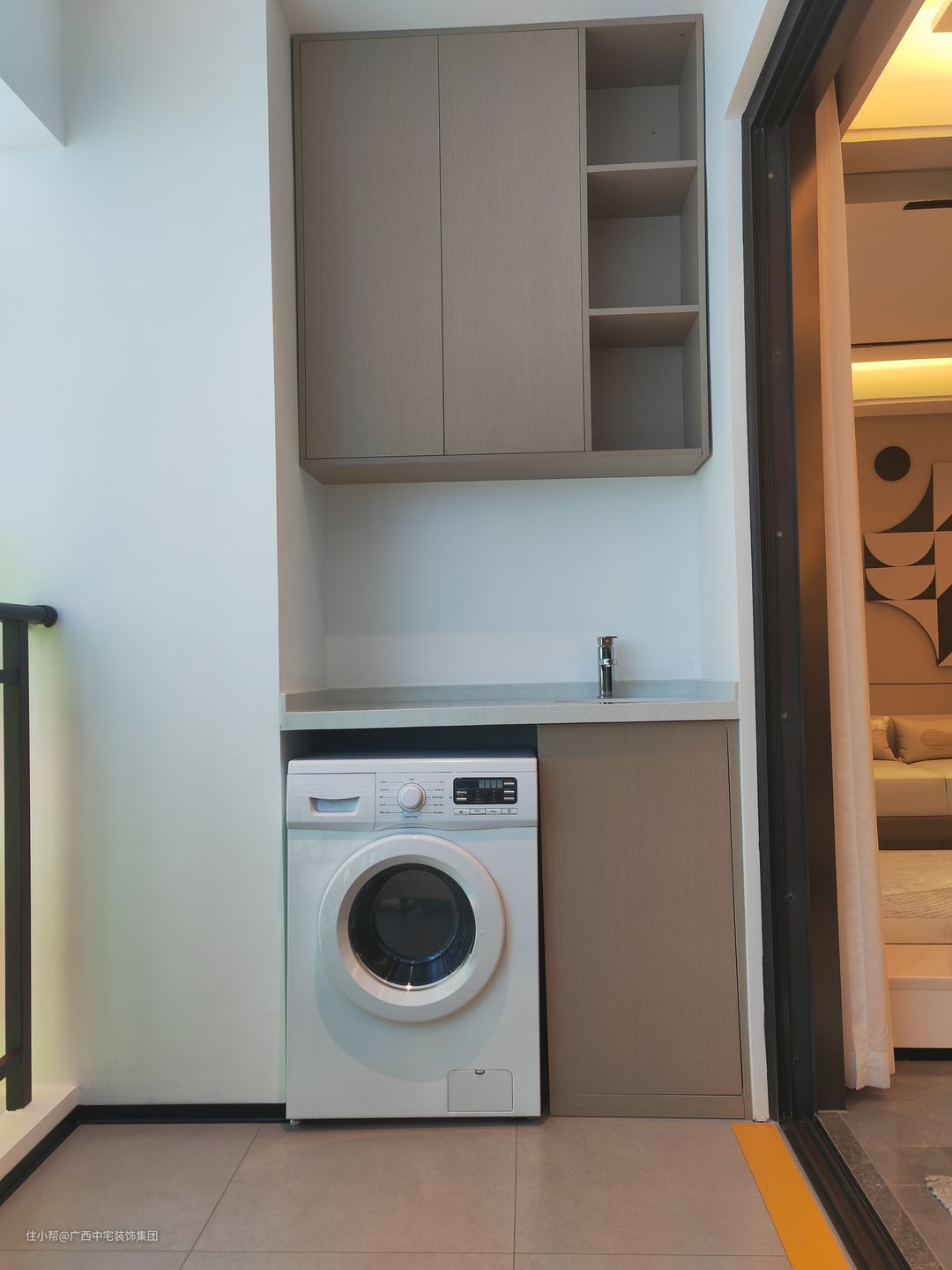 客厅阳台玻璃推拉门不变,让室内光源充足,视线更好。一侧放置的洗衣柜,上面储物,中间清洗,下面放置洗衣机,一体多用,功能强大,简直太实用了,化身功能好帮手。