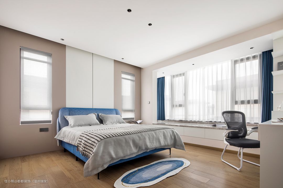 次卧背景墙采用白色木质护墙,搭配简洁的射灯灯带结合,素雅的蓝白色使得空间更具质感,飘窗给室内空间带来足够的自然采光,还提高了卧室的休闲性质。飘窗处还增加了柜子空间,再铺设以木饰面,多个柜面并列通体是白黑撞色,构造简洁却存在感颇强。
