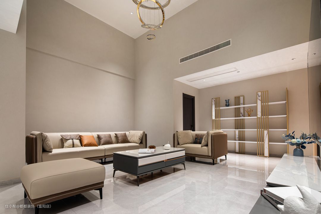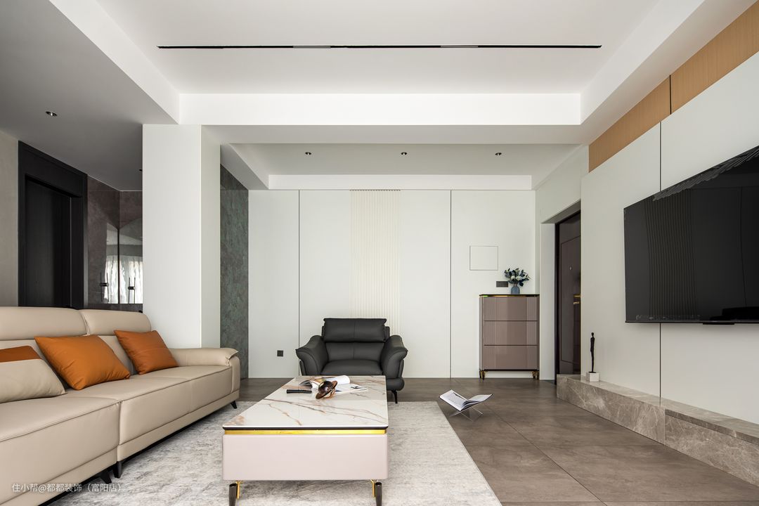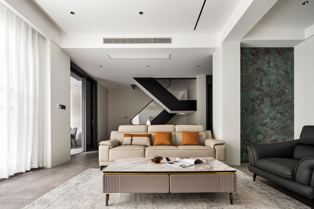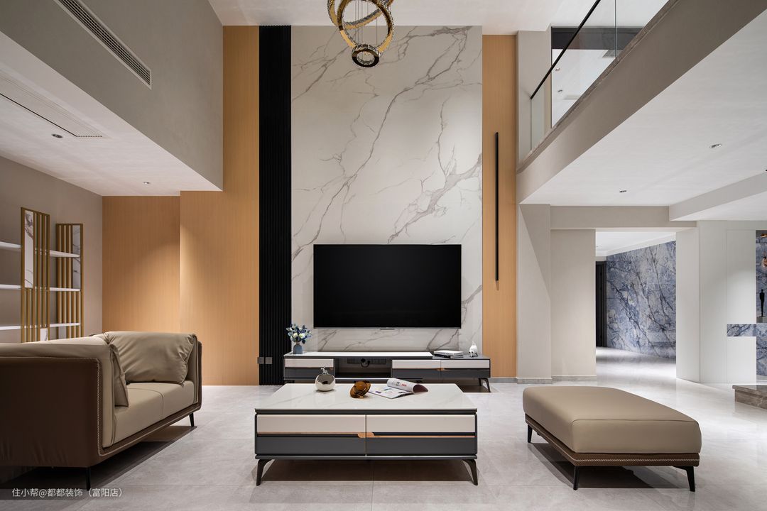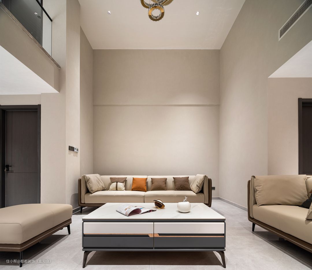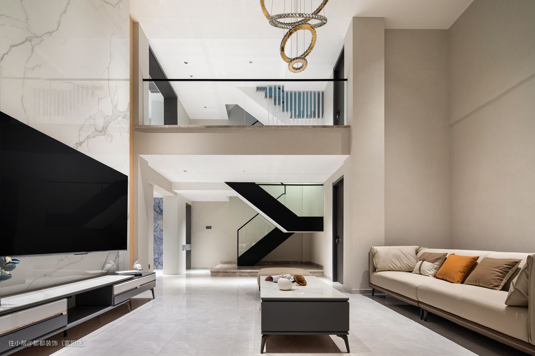客厅是中间挑空的跃层结构,上下双层的优势让家的改造空间无限大,简洁内敛的空间基调让屋主归家后的心情也焕然新,白色为主体颜色,干净、整洁之感安然呈现;超大的层高给人带来广阔的视觉冲击感。 电视背景墙通过色调柔润的奶白和原木撞色来搭配,做双眼皮灯带让空间有了温度,再加以纯白色颜色的窗帘点亮空间,使空间更加仙气灵动。 软装的布置上富有生活气息,奶咖色亮面质感的沙发线条流畅、柔软舒适,搭配大理石组合茶几,整体简练时尚的同时也不失浪漫典雅。 对于家里是跃层户型的屋主来说,楼梯的空间是很重要的一节,玻璃面扶手增加通透感,浅咖大理石台面给人一种步步生莲的美感。