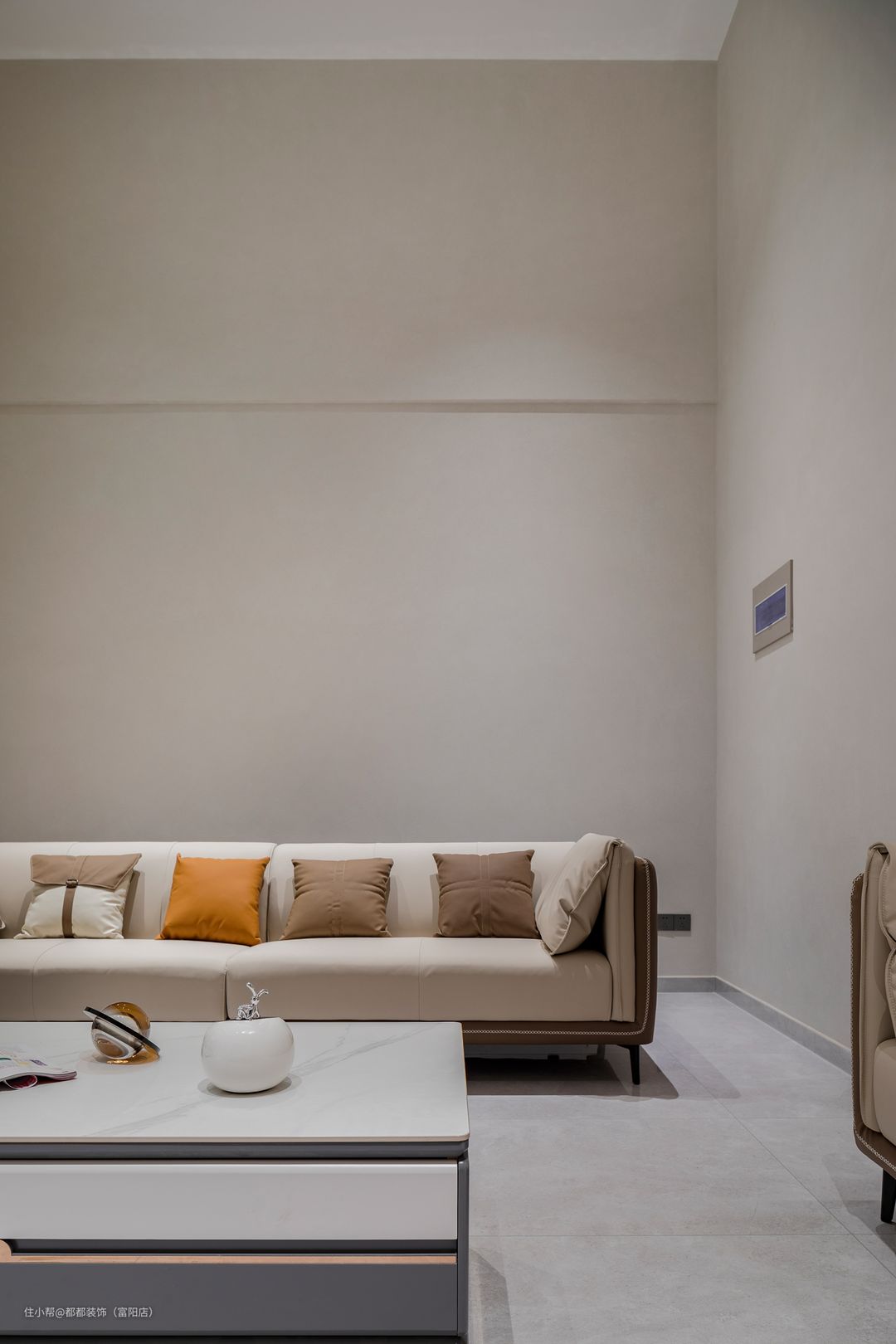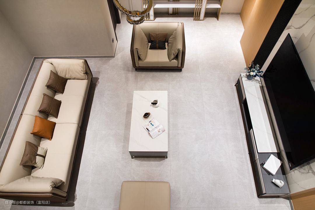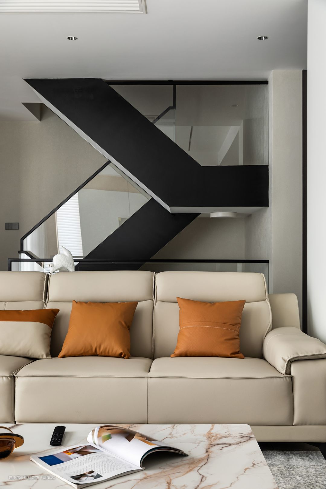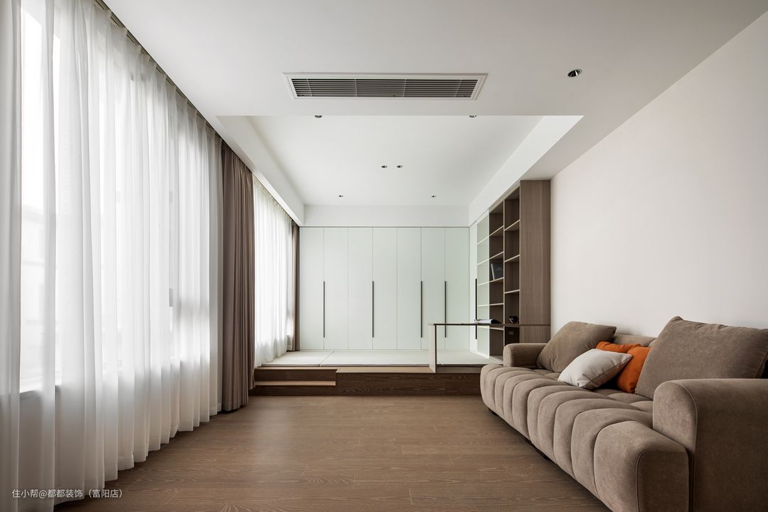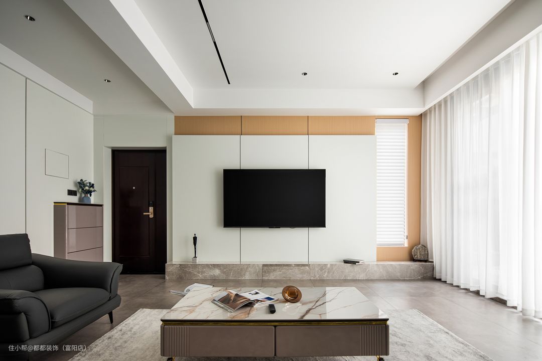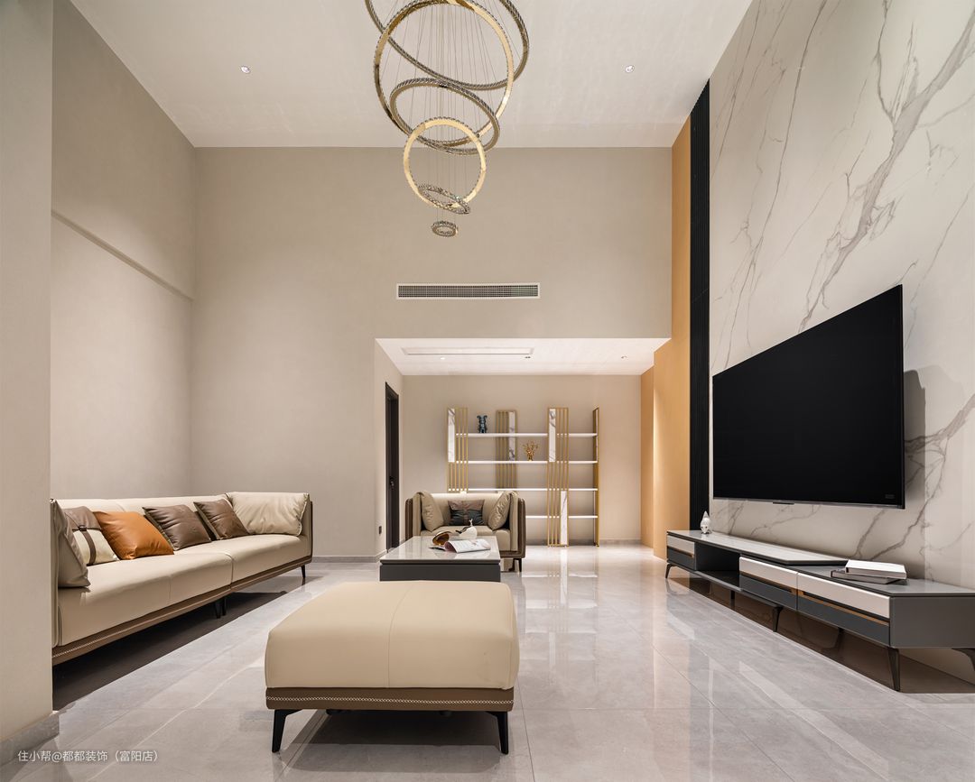 客厅是中间挑空的跃层结构,上下双层的优势让家的改造空间无限大,简洁内敛的空间基调让屋主归家后的心情也焕然新,白色为主体颜色,干净、整洁之感安然呈现;超大的层高给人带来广阔的视觉冲击感。 电视背景墙通过色调柔润的奶白和原木撞色来搭配,做双眼皮灯带让空间有了温度,再加以纯白色颜色的窗帘点亮空间,使空间更加仙气灵动。 软装的布置上富有生活气息,奶咖色亮面质感的沙发线条流畅、柔软舒适,搭配大理石组合茶几,整体简练时尚的同时也不失浪漫典雅。 对于家里是跃层户型的屋主来说,楼梯的空间是很重要的一节,玻璃面扶手增加通透感,浅咖大理石台面给人一种步步生莲的美感。