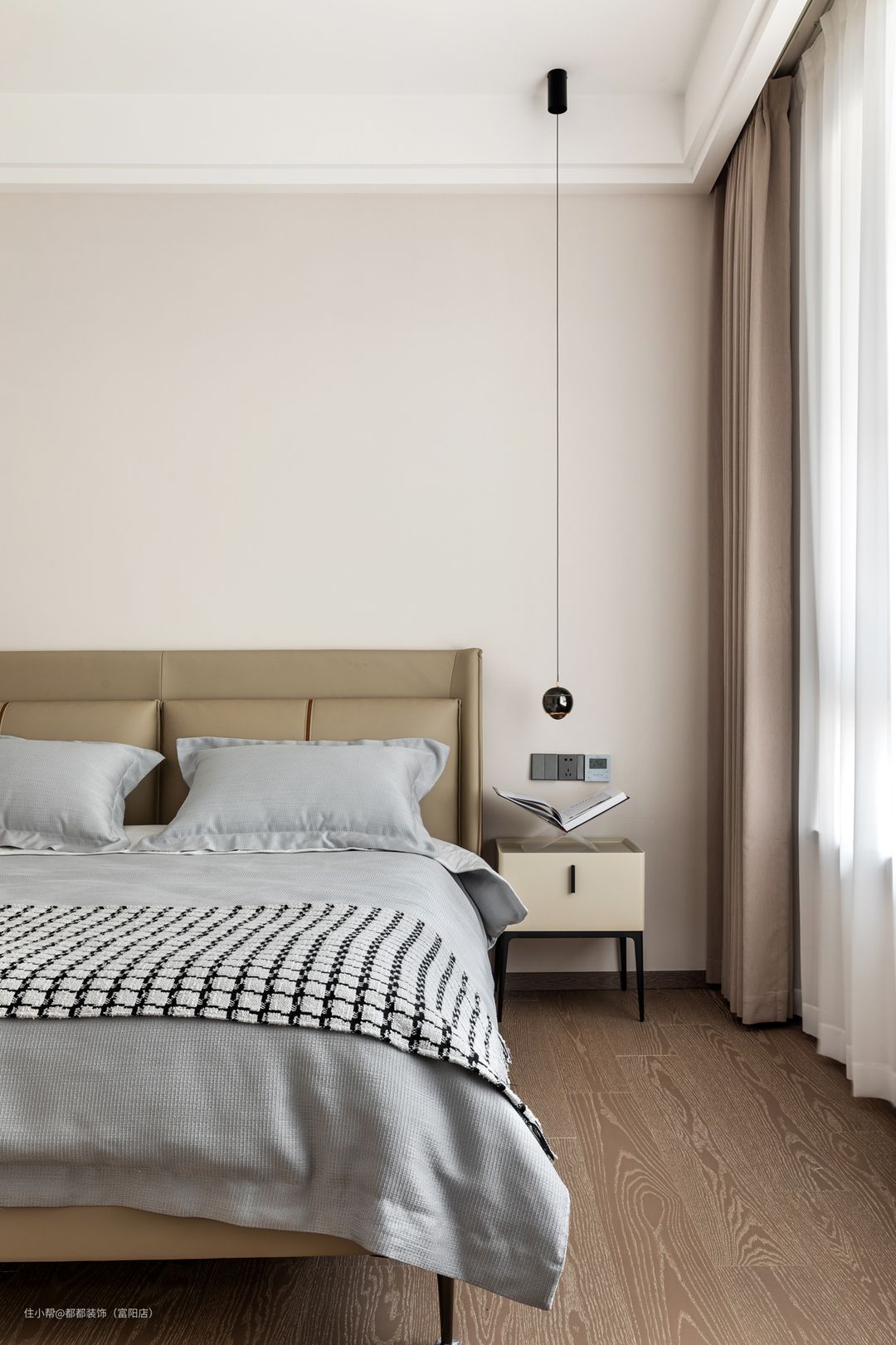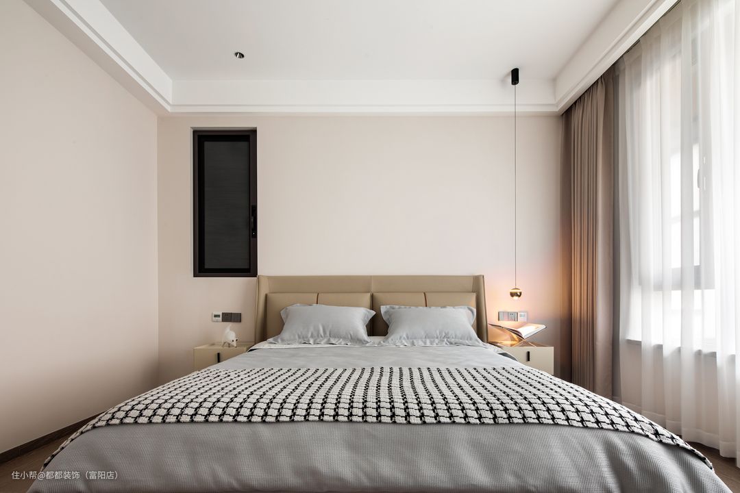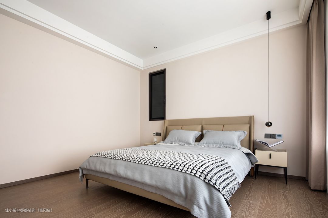 主卧作为使用时间最久的场所,舒适度尤为主要,整个房间的颜色搭配让人舒适愉悦,很有休息的氛围,咖色皮质床高级有质感,搭有富有设计感的床头灯,使房间有了亮点。