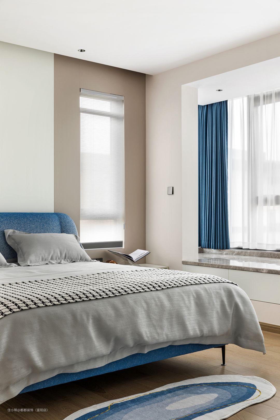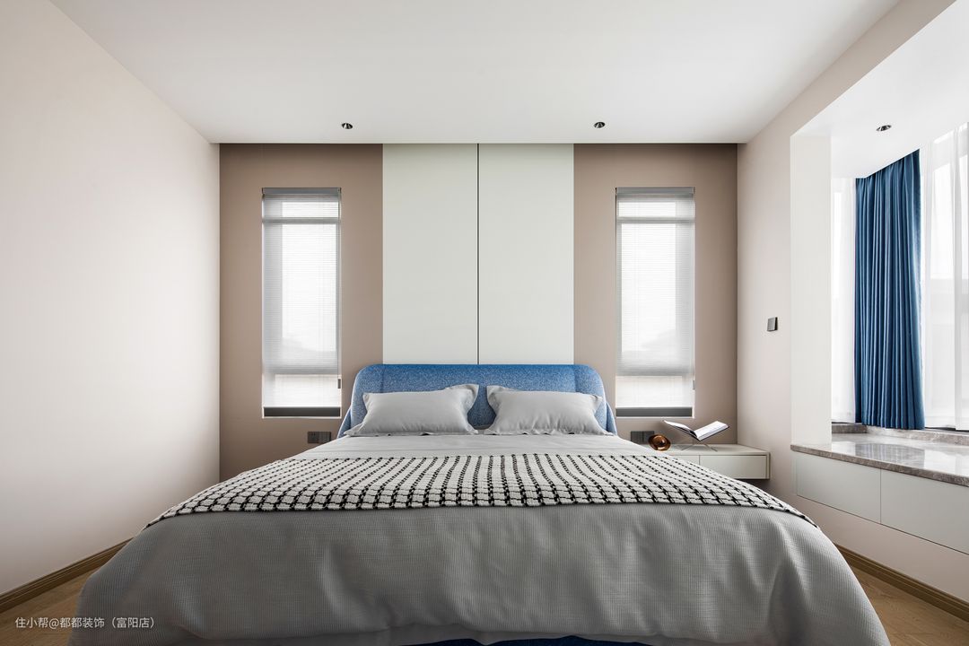 次卧背景墙采用白色木质护墙,搭配简洁的射灯灯带结合,素雅的蓝白色使得空间更具质感,飘窗给室内空间带来足够的自然采光,还提高了卧室的休闲性质。飘窗处还增加了柜子空间,再铺设以木饰面,多个柜面并列通体是白黑撞色,构造简洁却存在感颇强。