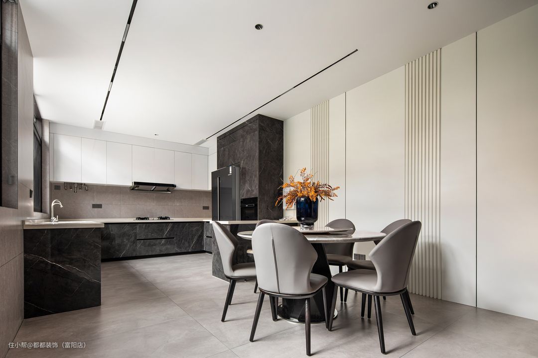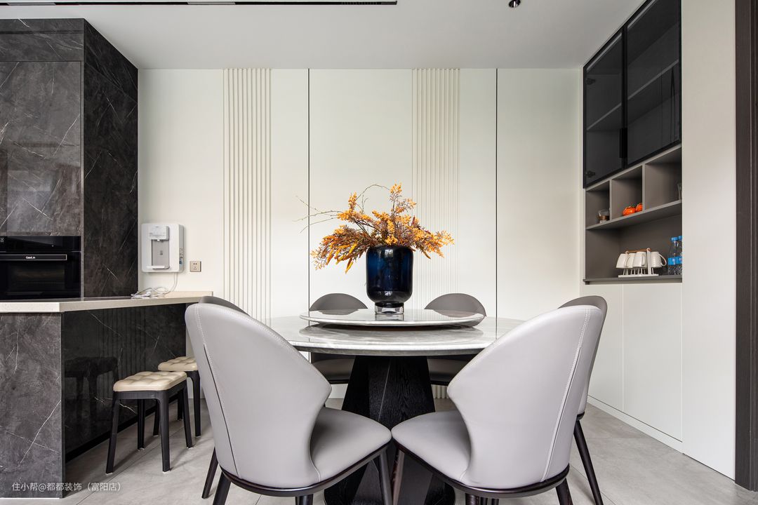 餐厅的主家具也都充满了轻奢的风韵,大理石台面与设计感十足的桌腿交相辉映,相得益彰,软皮的餐椅温馨优雅,而跳跃的亮黄色则为整个空间增添了些许层次感与浪漫情调,是趣味的碰撞与流动。 餐厅后面特意做了一整墙的展示柜和餐边柜,白色柜面恰到好处的留白,射灯的搭配随着光影若隐若现的朦胧黑色玻璃,呈现出摩登情调,干净整洁又不失雅致。