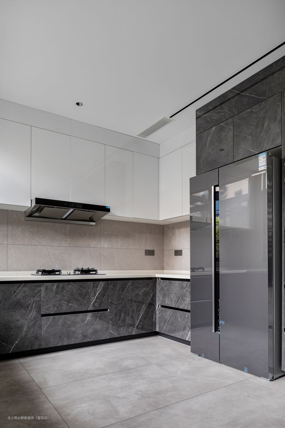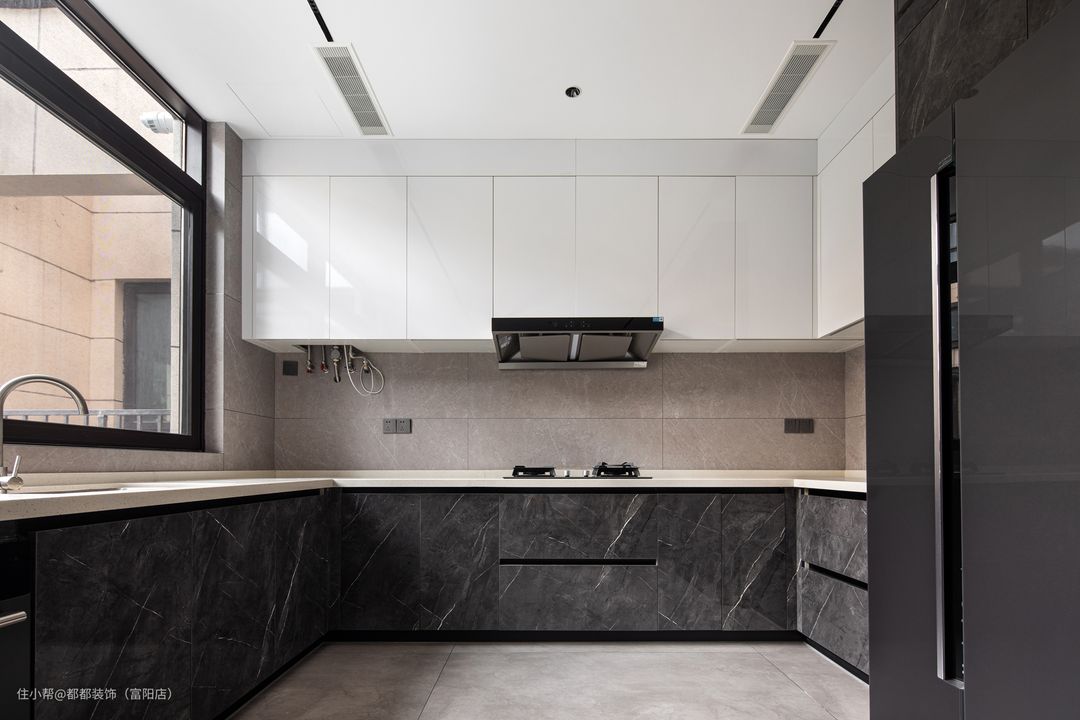 将原来的厨房空间外扩,形成U型布局的厨房,侧边窗户和灯具让采光性极佳,放眼放去整体布局紧凑有序,采用上下双层柜体增强收纳空间,白色系的橱柜显得轻盈而整洁,把冰箱放在厨房外侧,这让厨房的每一寸面积都得到了合理利用。