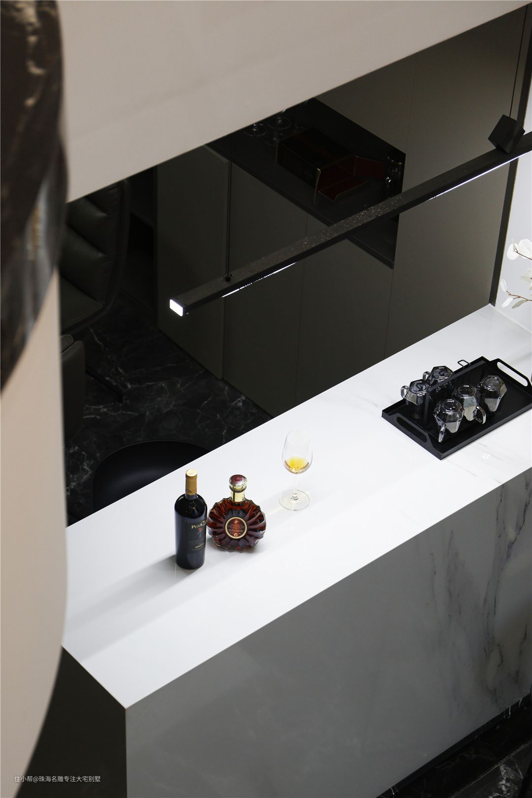 吧台设置在餐厅的延展处,与简约明亮的餐厅,形成了鲜明的色彩比对,加上地面通透的纹理的点缀刻画,贯通一体,让两个空间有巧妙的契合,好无突兀之感,不失又一处点睛之笔。