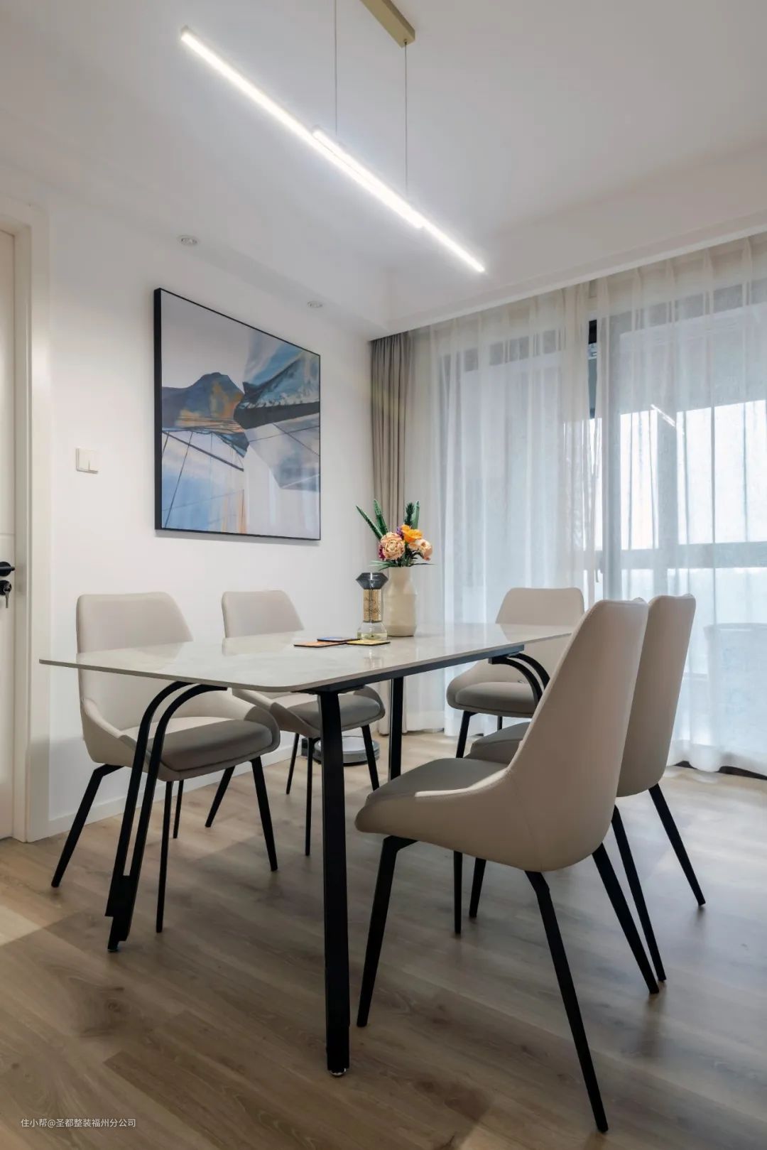 整个客餐厅打开后,在沙发上的人起身走两步就能去厨房做个甜品或者烹饪一桌大餐,用完餐的盘子起身顺手就能放进洗碗机,然后再去沙发上看电视休息。 不仅空间上的感受变大变舒畅了, 动线也变得更短更便捷,也没有多的墙面去阻碍情感的交流。