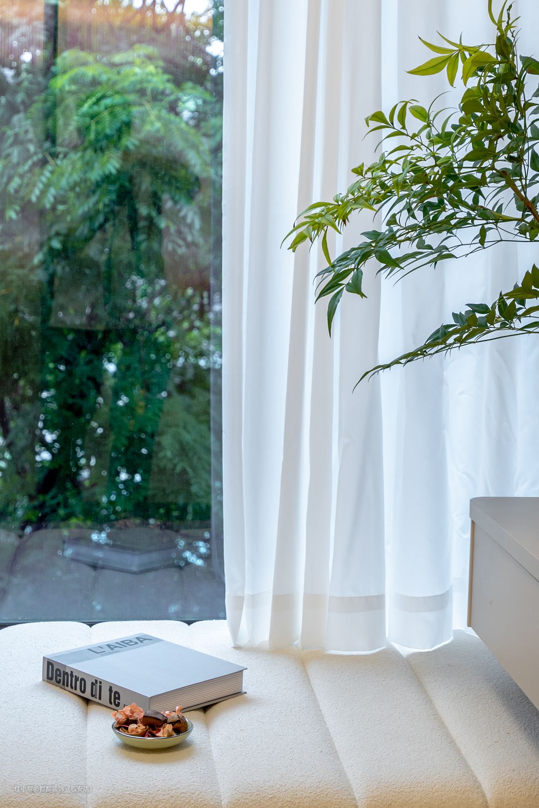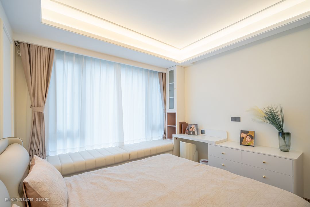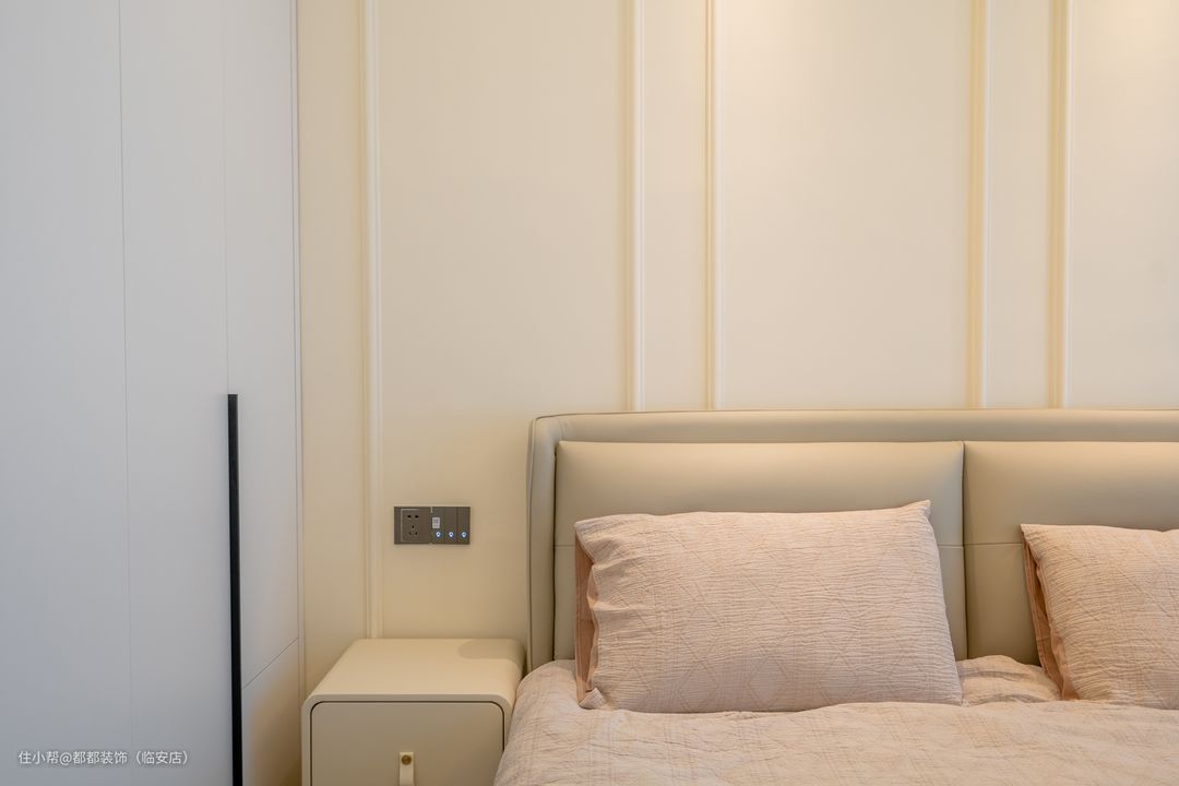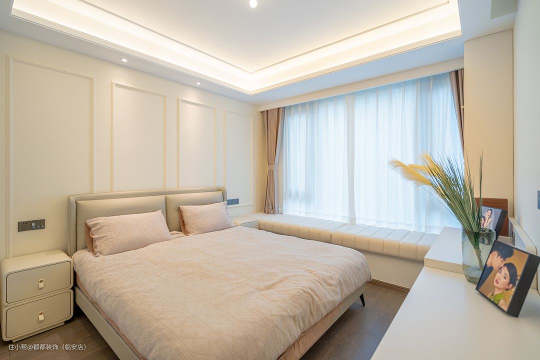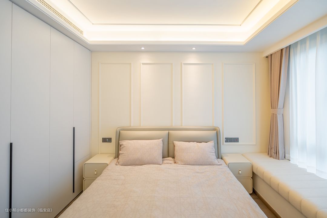 奶白配色的主卧空间,高级随性、极致丝滑;床头背景由法式石膏线条点缀,凸显空间层次与沉稳气质,让人沉醉于休憩时光,在这里仿佛连梦境都变得甜美了。 飘窗铺上柔软的垫子,搭配奶白色柜子,在视觉观感上做到简约清爽的同时,与空间整体氛围相得益彰。这种如同奶油感的温柔配色,用作卧室空间设计也非常不错,整个房间就像自带温柔滤镜,真的治愈感超强,想瞬间拥有!