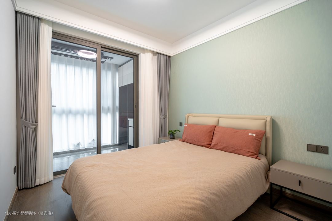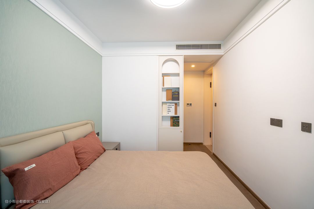 次卧是马卡龙色系的搭配,豆绿色的墙壁,肉粉色的床品,有点像西瓜的配色,这种亮丽的色彩搭配显得空间比较明亮,令人感到放松且充满幸福感,软包米白床头与同款床头柜搭配,营造一个甜蜜舒睡的卧室环境。