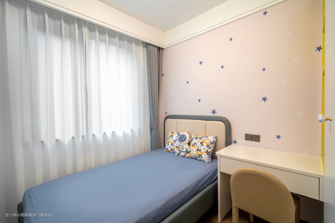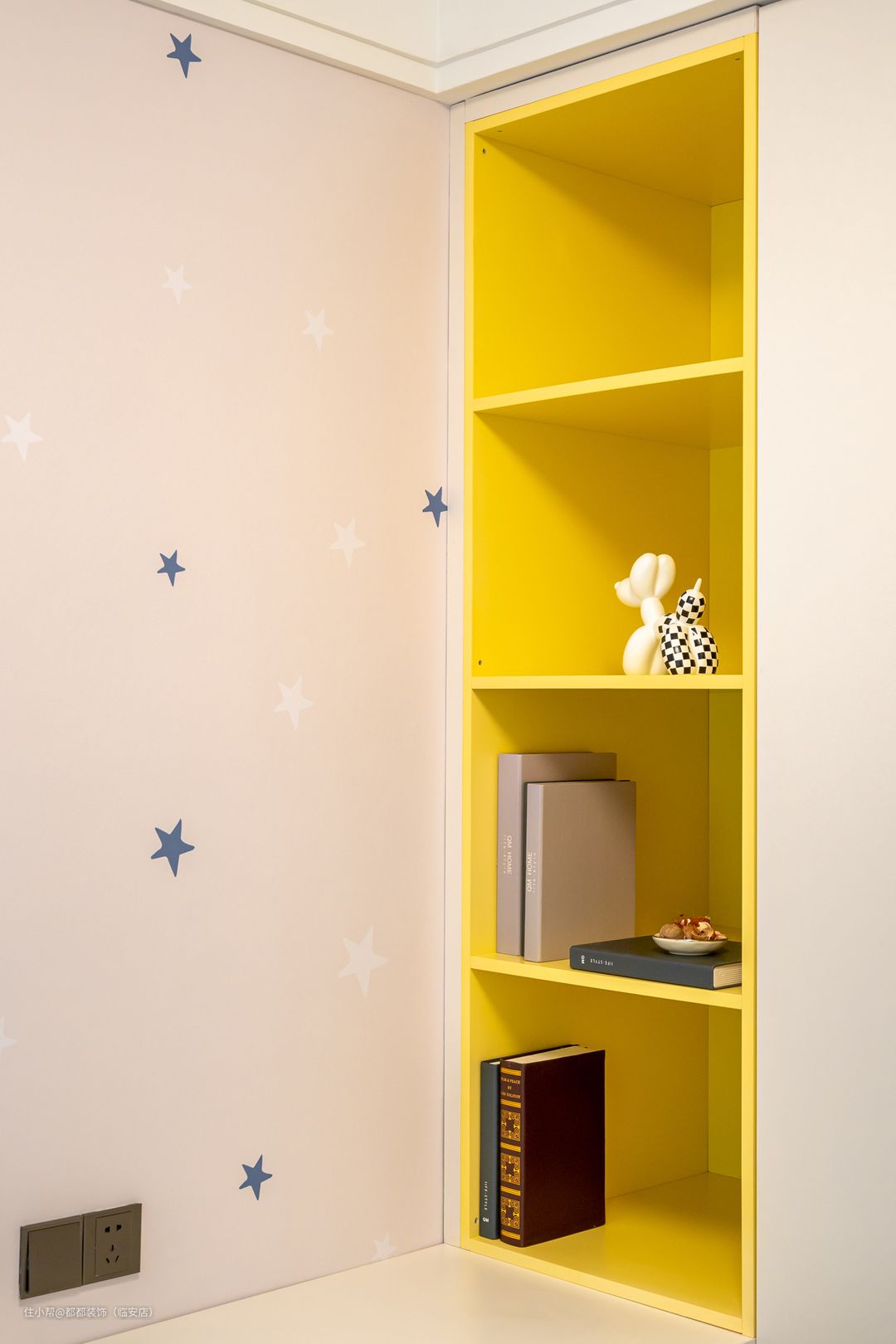 儿童房用星星点缀背景墙,明黄色的柜体和天蓝色的床相映衬,不得不说,有时候适当的加入一些契合空间设计的装饰小物,真的会带来不一样的感觉。 在满室童趣中,总是不知觉陷入慵懒温柔乡中;所有的疲惫与焦虑都得到了抚慰,既适合心思浪漫的大人,也适合可爱天真的孩童。