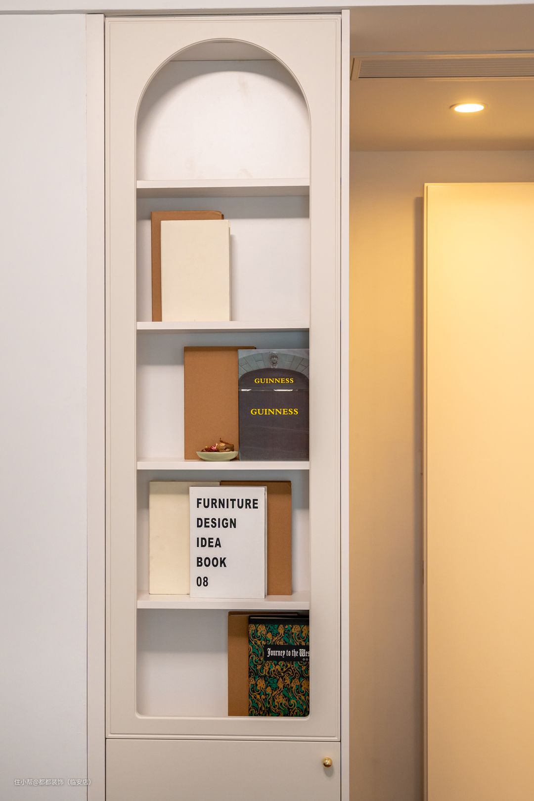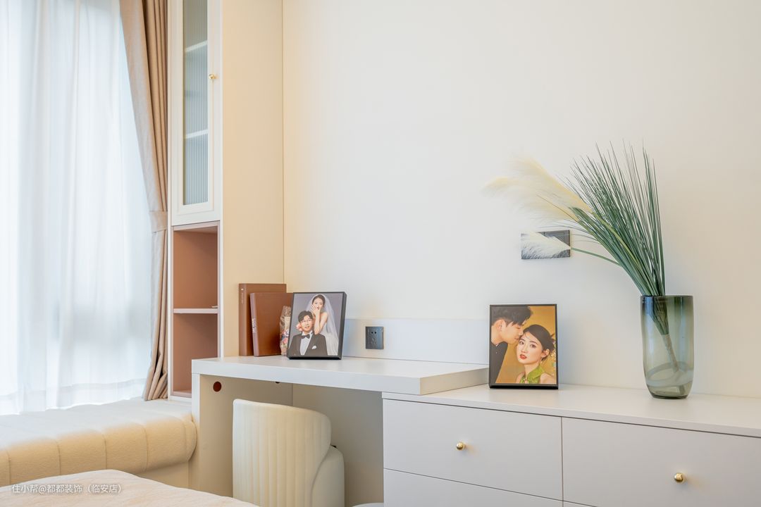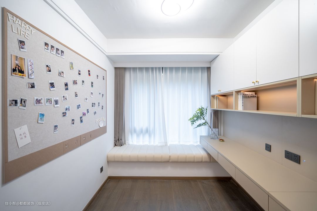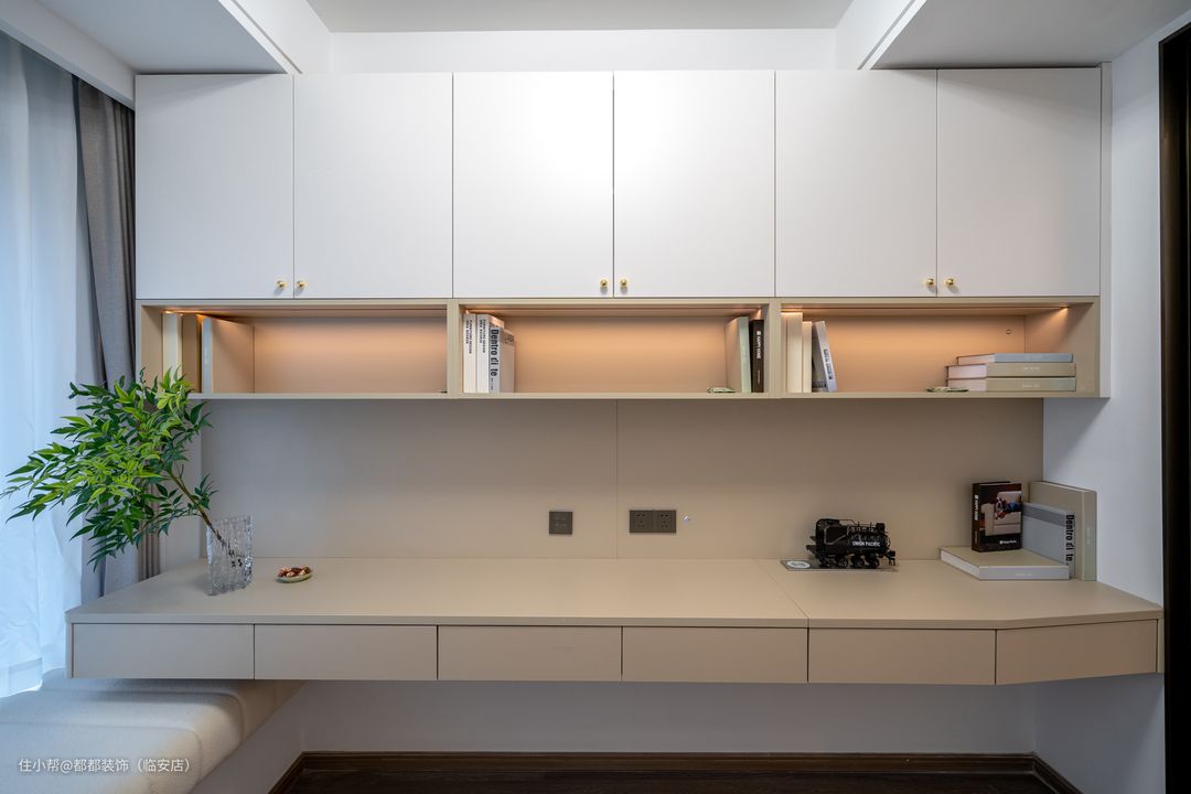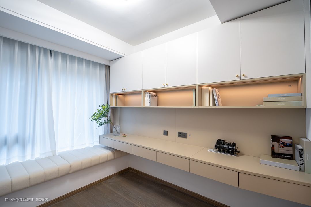 书房延续了奶白的配色,这样的配色营造的氛围宁静、自然;搭配绿植点缀,可以让心情更加平稳舒适。衣柜与飘窗之间,连接衣柜定制书桌书柜,轻松打造一个小书房。书柜的到顶设计增加了多重储物空间,可放置书籍资料,以及喜爱的装饰物品。