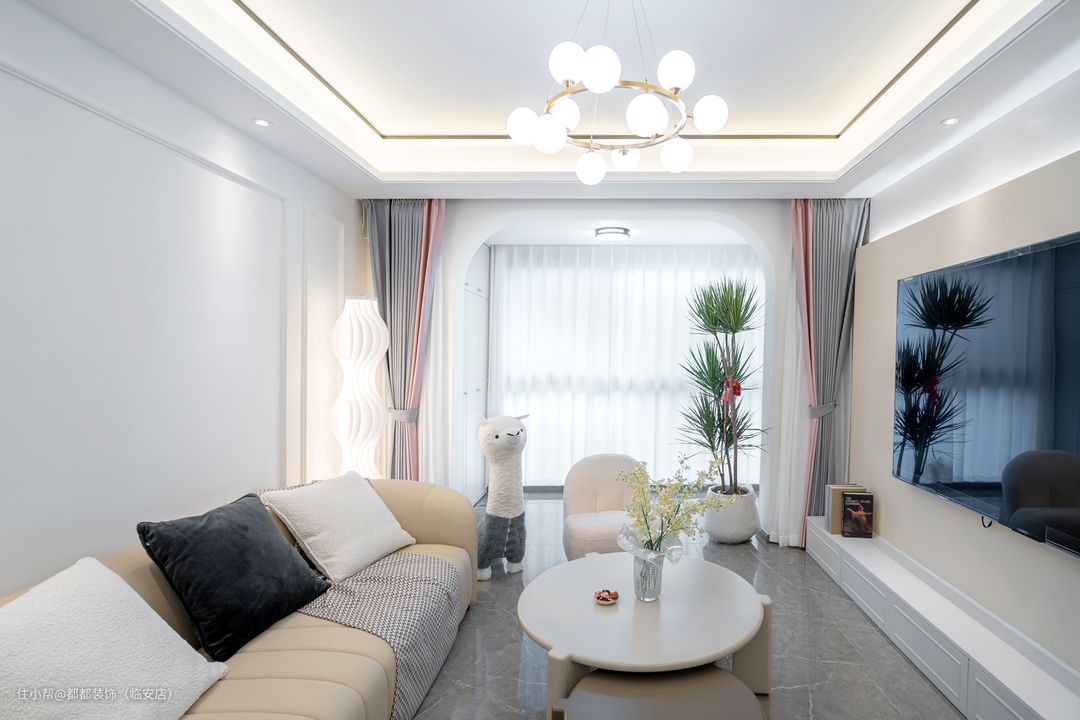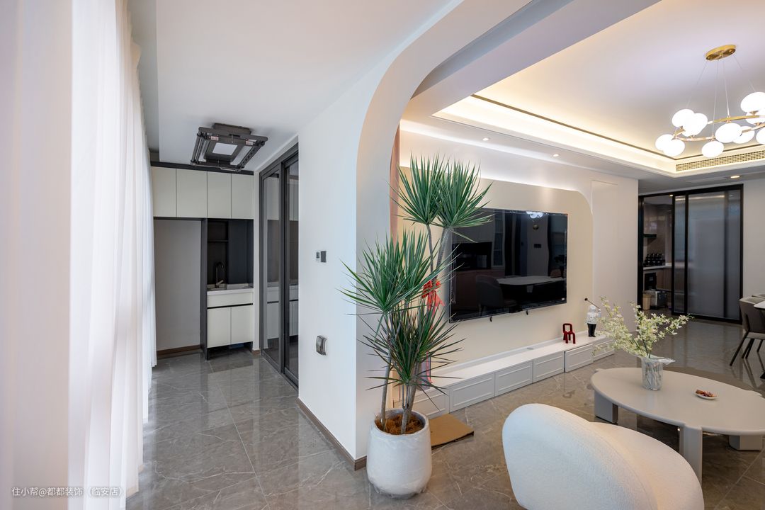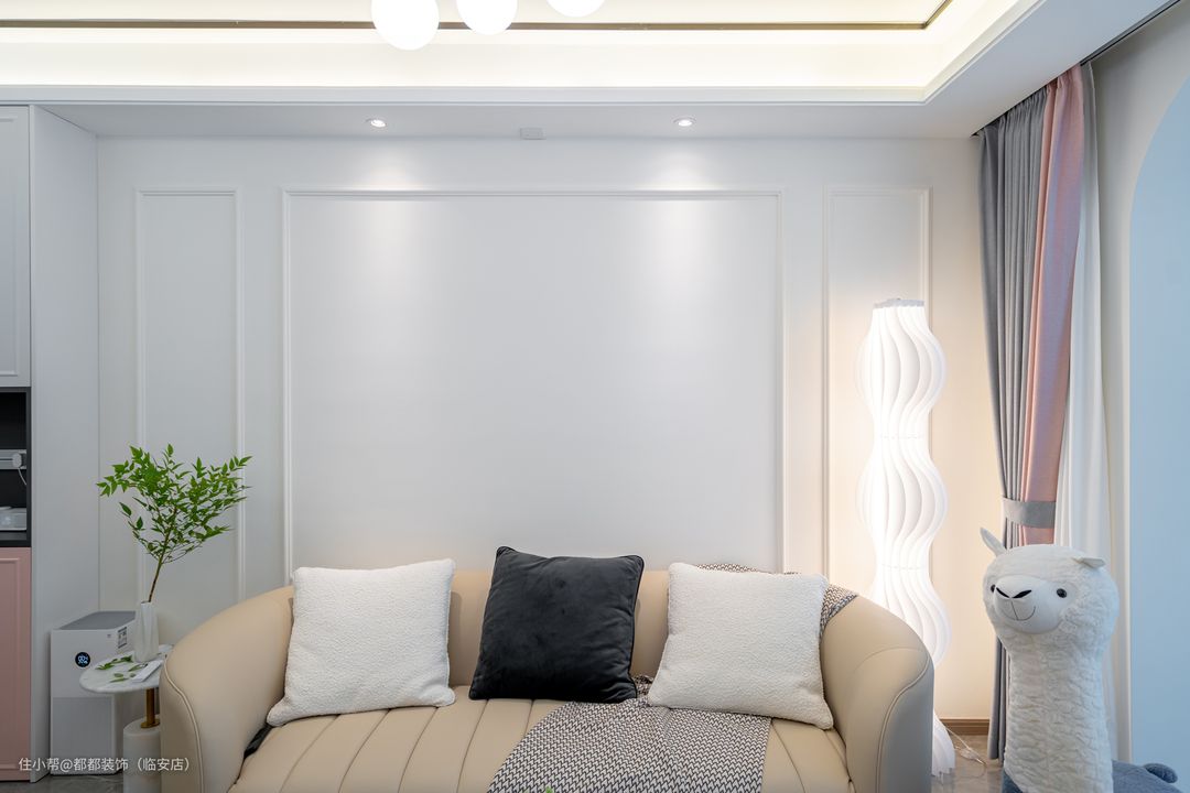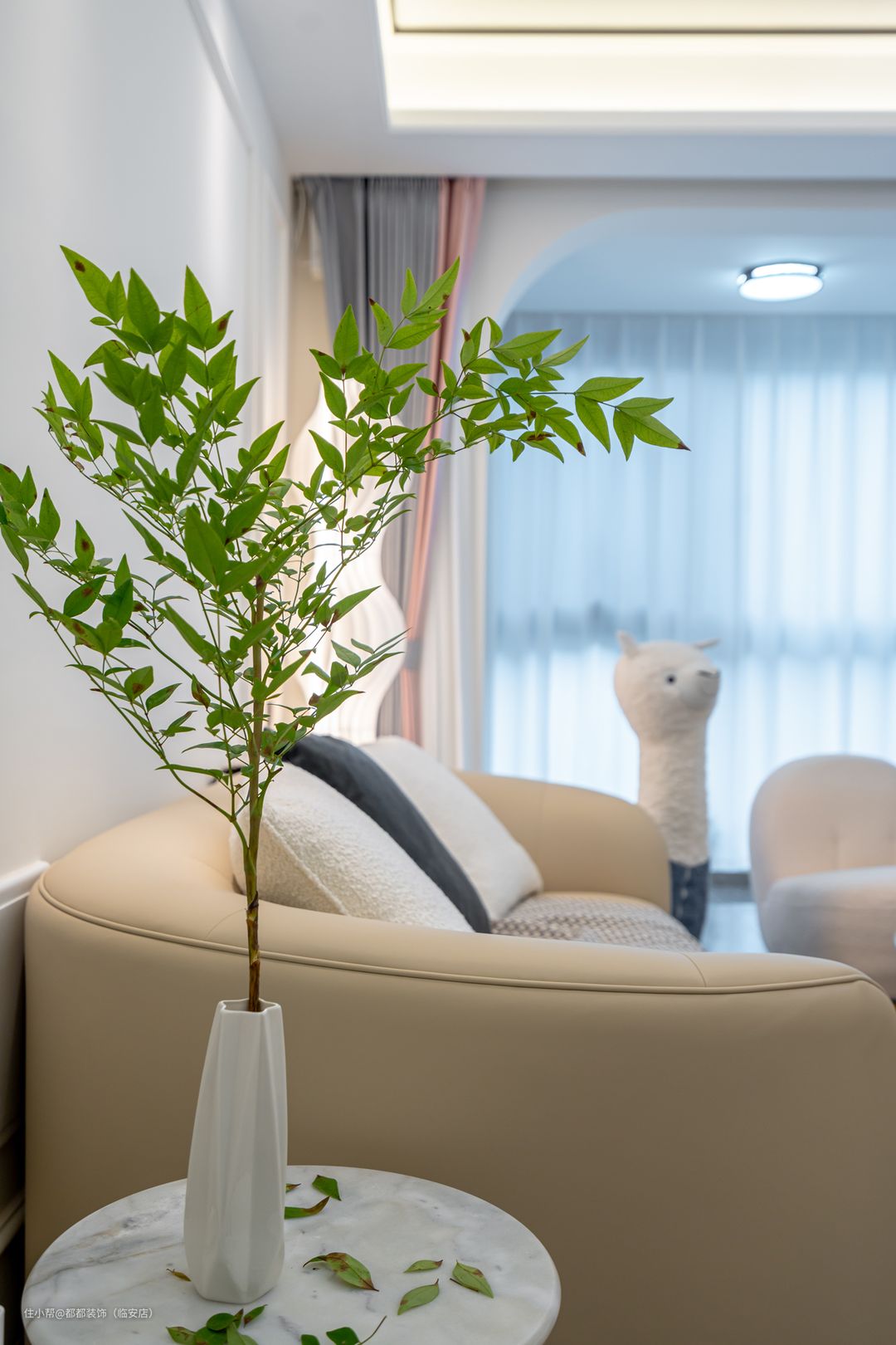 客厅在硬装上采取简洁设计,软装则以柔和为主,搭配亮度及饱和度较低的米色沙发,让空间在简洁通透之外,还多了一丝舒服治愈的气息,营造出类似奶油般的柔和温馨氛围,让人从视觉上、精神上得到放松的感觉。 沙发背景墙利用石膏线美化边角,借曲线造型的沙发化解锐角,维持环境柔和温暖的基调,给人带来清新的浪漫风,极简的设计感,精致的氛围感。 阳台包进客厅,拆除阳台移门,做拱形石膏门,"曲线"、"圆弧"元素可以弱化屋梁结构,柔化空间线条感,让整体风格清新活泼、又灵动飘逸,赋予空间温馨的氛围。 如果觉得搭配后的氛围过于深沉,除了调整颜色的饱和度,也不妨点缀绿植注入生机,也起到跳色的作用。