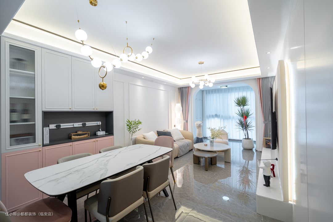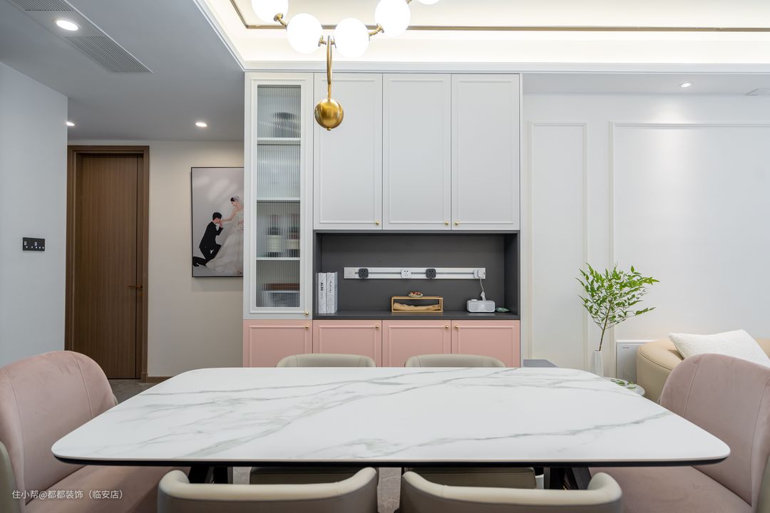 客餐厅一体设计显得空间更加宽敞,白色岩板餐桌搭配卡其色软包椅子,简到本质的美,体现出的是一种对时尚的追求。创意又有个性的吊灯造型别致,不管是精简的外框,还是局部的凹型,细腻而富有张力的现代几何感呼之欲出。