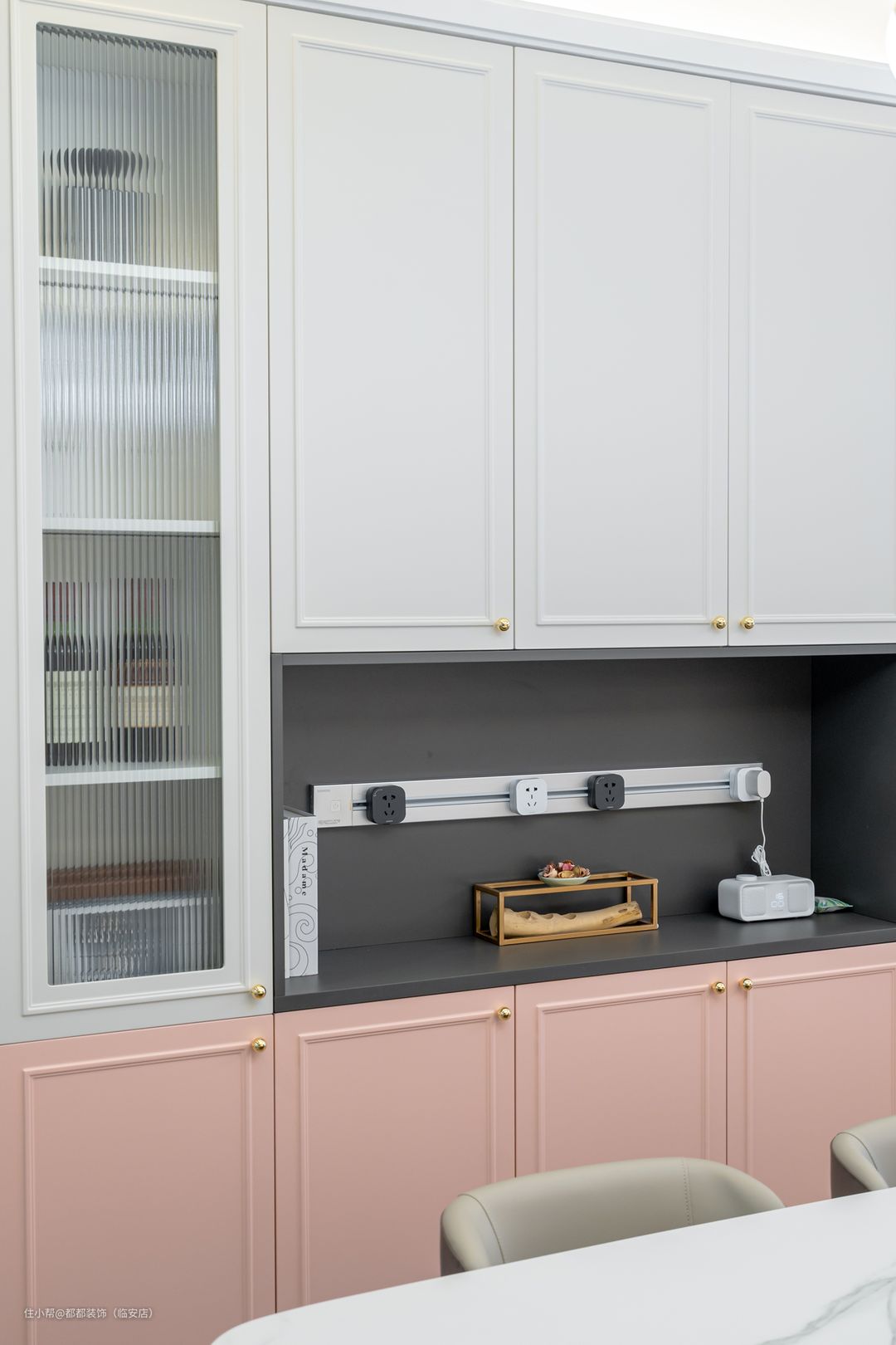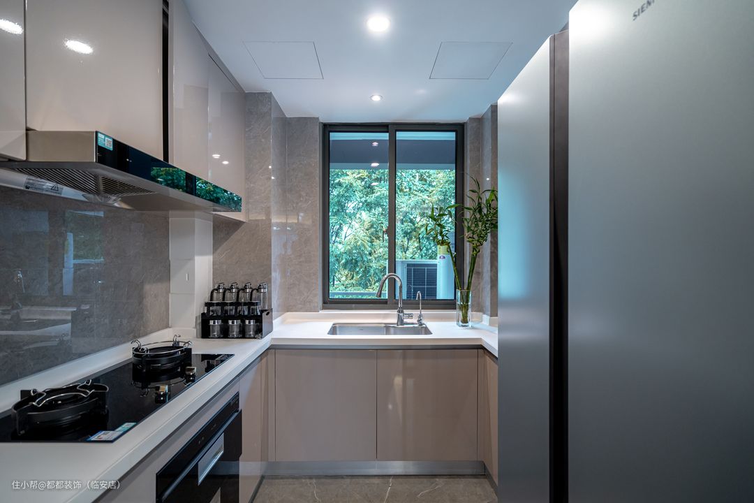 厨房是U型设计,大理石墙面、浅卡其色橱柜组合,有一种温暖柔和的质感,增加了操作台的面积,靠墙设计收纳系统,将冰箱嵌入,放眼望去有一种协调的美感,厨房的烟火气,总让人觉得特别暖心踏实。