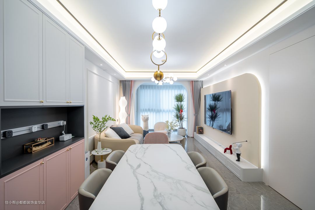 客餐厅一体设计显得空间更加宽敞,白色岩板餐桌搭配卡其色软包椅子,简到本质的美,体现出的是一种对时尚的追求。创意又有个性的吊灯造型别致,不管是精简的外框,还是局部的凹型,细腻而富有张力的现代几何感呼之欲出。