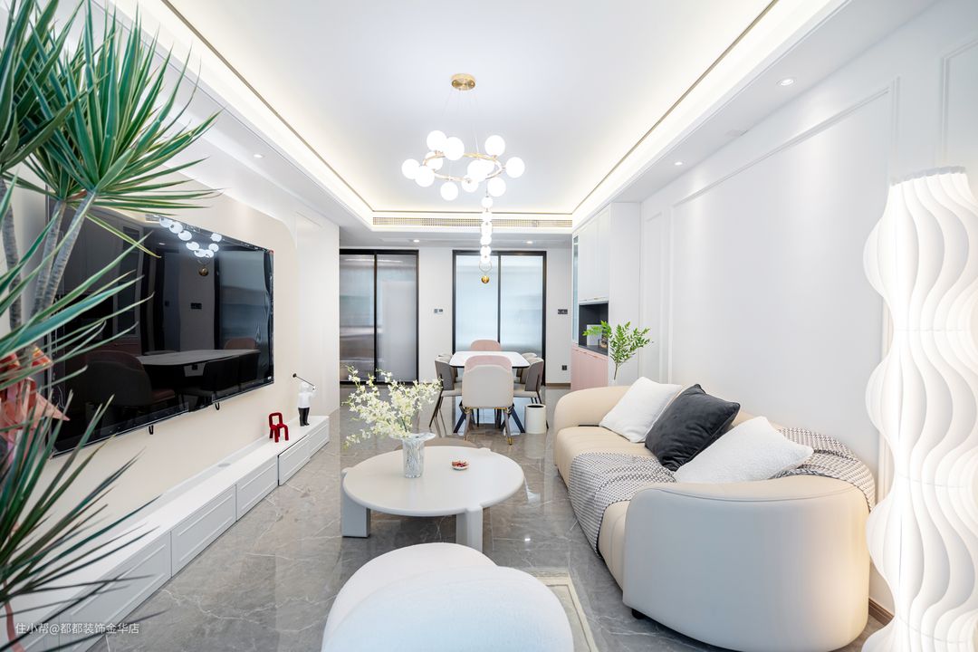 客厅在硬装上采取简洁设计,软装则以柔和为主,搭配亮度及饱和度较低的米色沙发,让空间在简洁通透之外,还多了一丝舒服治愈的气息,营造出类似奶油般的柔和温馨氛围,让人从视觉上、精神上得到放松的感觉。 沙发背景墙利用石膏线美化边角,借曲线造型的沙发化解锐角,维持环境柔和温暖的基调,给人带来清新的浪漫风,极简的设计感,精致的氛围感。 阳台包进客厅,拆除阳台移门,做拱形石膏门,"曲线"、"圆弧"元素可以弱化屋梁结构,柔化空间线条感,让整体风格清新活泼、又灵动飘逸,赋予空间温馨的氛围。 如果觉得搭配后的氛围过于深沉,除了调整颜色的饱和度,也不妨点缀绿植注入生机,也起到跳色的作用。