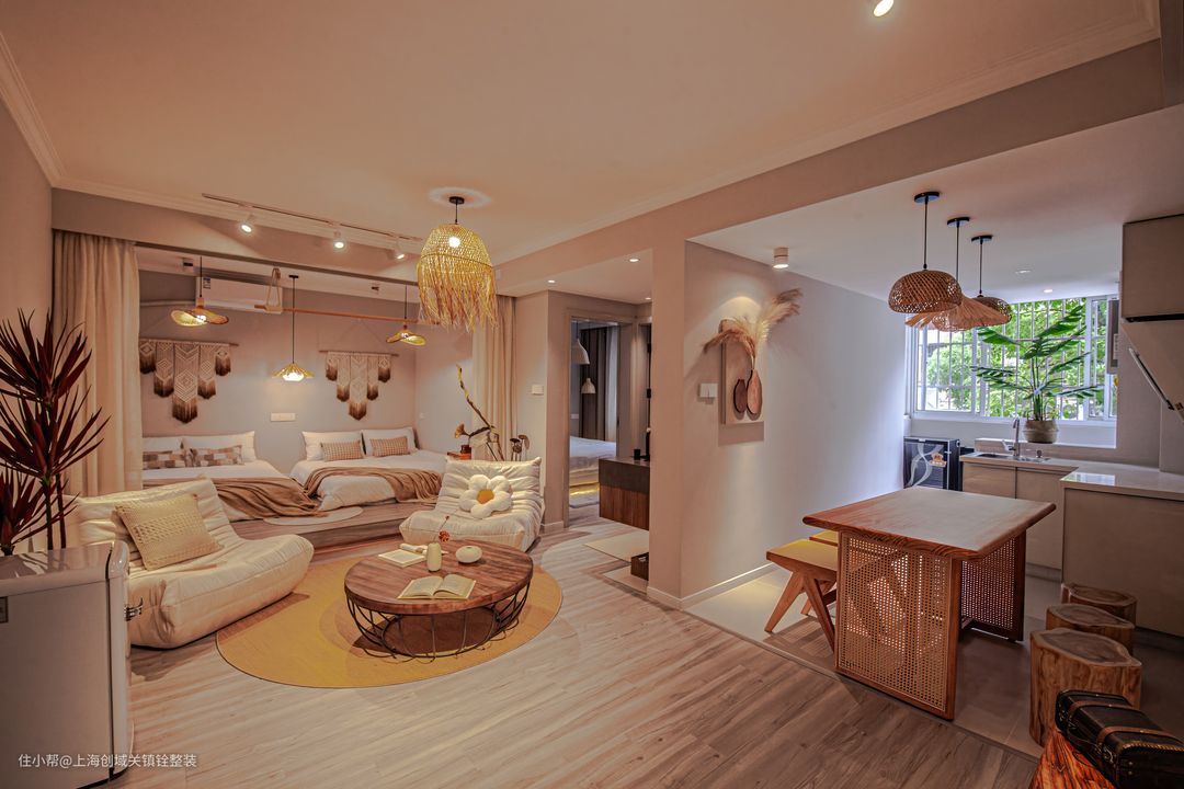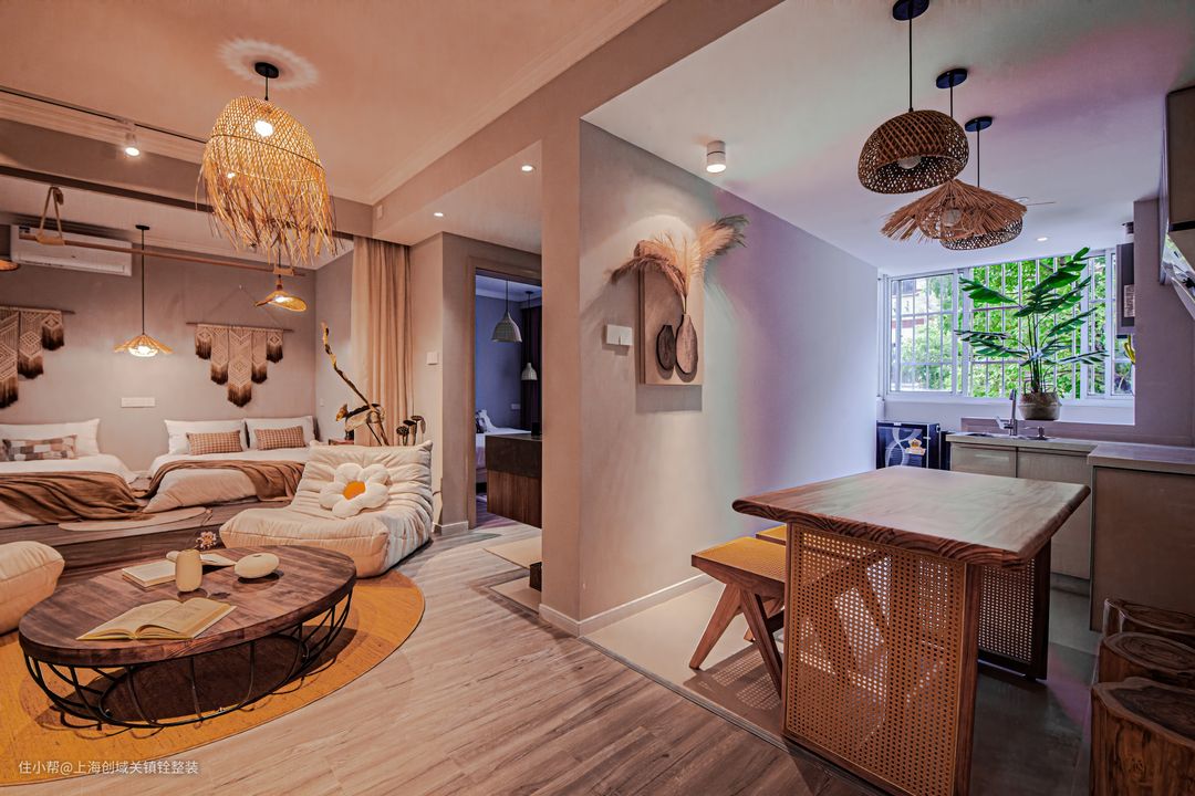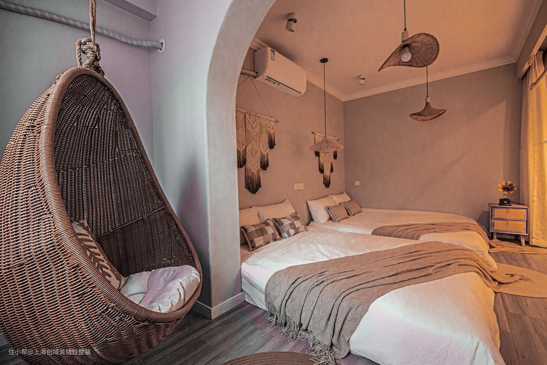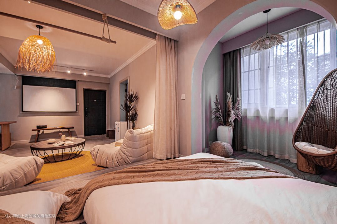 卧室的特性一目了然,复古、禅意、秘境。我们在设计中融入了多彩的云南特色,并且选用众多民族物品来将民宿的要素凝练于一室之中,塑造纯粹的心无旁骛的休息空间。 纵观主卧采集到的软装,让空间自然而然生出淡然自若的情愫。和北欧风一样,日式榻榻米独具朴实之情,两床柔软温暖的床铺,两面北欧流苏织毯,两盏日式竹编吊灯,再摆放一些精致小巧的物件,都能很轻松地让居者平静下来,远离魔都的灯火繁华与兵荒马乱,在自己的家里,拥有真正的慵懒与松弛。 好的设计,是生活与向往的纽带,通过软装和硬装的默契搭配,业主所触摸到的每一件生活物品,即是心中向往的世界本身,更是对未来时光的一种殷殷期许。 阳台合入主卧,提升空间采光与通风实力,优雅的拱形门廊刻画更为精美的异域风情。与此同时,阳台的休闲功能也被兼顾到。 北欧侘寂风树桩蕴含实木美学,日式圆形的蒲草地毯演绎古朴情怀,秋千吊篮椅编织温暖的舒适小窝,此时来点午后阳光最适宜,在摇摇晃晃的吊椅上小憩一会,感受微风拂过脸庞、吹开书页,一缕缕阳光透过窗帘的缝隙,在地毯上映出一片斑驳。