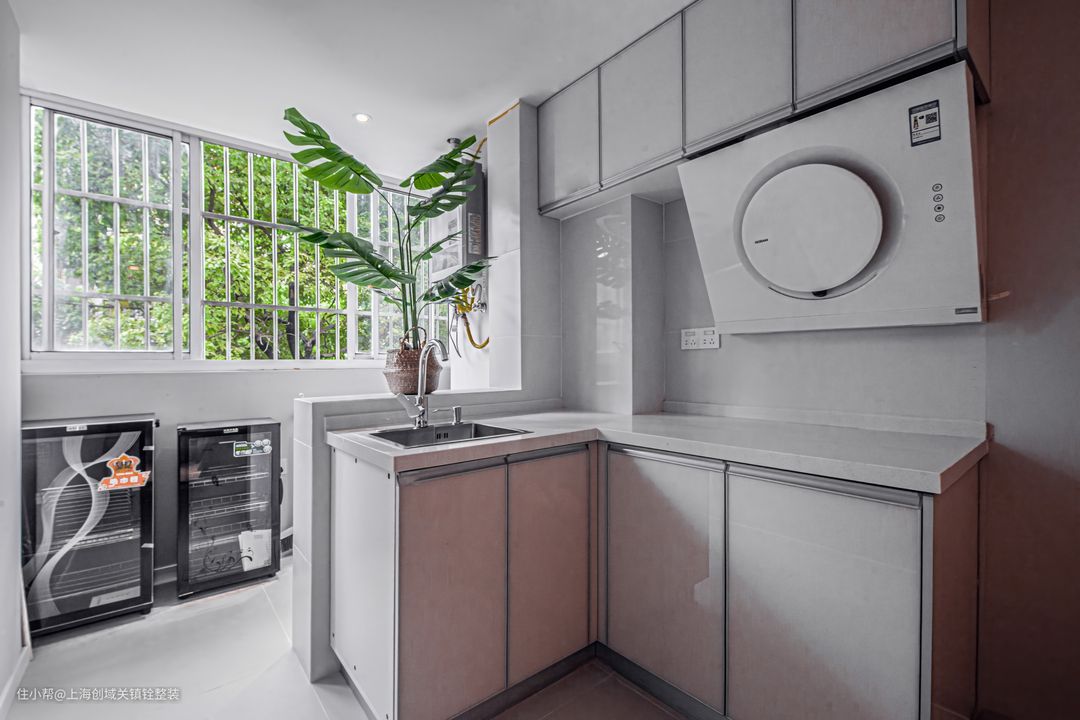 由于本案面积有限,所以厨房与餐厅之间不设界限,靠近窗户处为多功能厨房:L型台面一端安装燃气灶具组合和上下吊柜,另一端安装洗水池,台面上可以增设一些西厨设备,通过有序的使用习惯和操作流程,来分配相对应的操作空间,划分出“准备区”,“切割区”,“烹饪区”和“烤炉区”等,从而实现中西双厨的互补与均衡,完成多种不同的菜式的制作和烹饪功能。 厨房温度以象牙灰色调为主,这是一种低饱和度的灰色调,它的颜色比较柔和,特别是灰色墙壁可以使灯光更加温暖,增加整个空间的亲和力,营造浓郁的情调感。为了平衡空间的冷暖,绿植与阳光都能注入源源生机,不会使人感到过于拘束和高冷。 整体厨房空间虽小,但紧凑不拥挤,视觉和谐且充满生活气息,再加上充足的储存和清理空间,达到厨房美观性与实用性相联合的两全结果。 厨房拨出一部分面积,作为小阳台使用,结合相邻的厨房,让生活动线更加简洁舒适,周末在厨房温一杯牛奶,随后窝在阳台的沙发上,看书看风景。