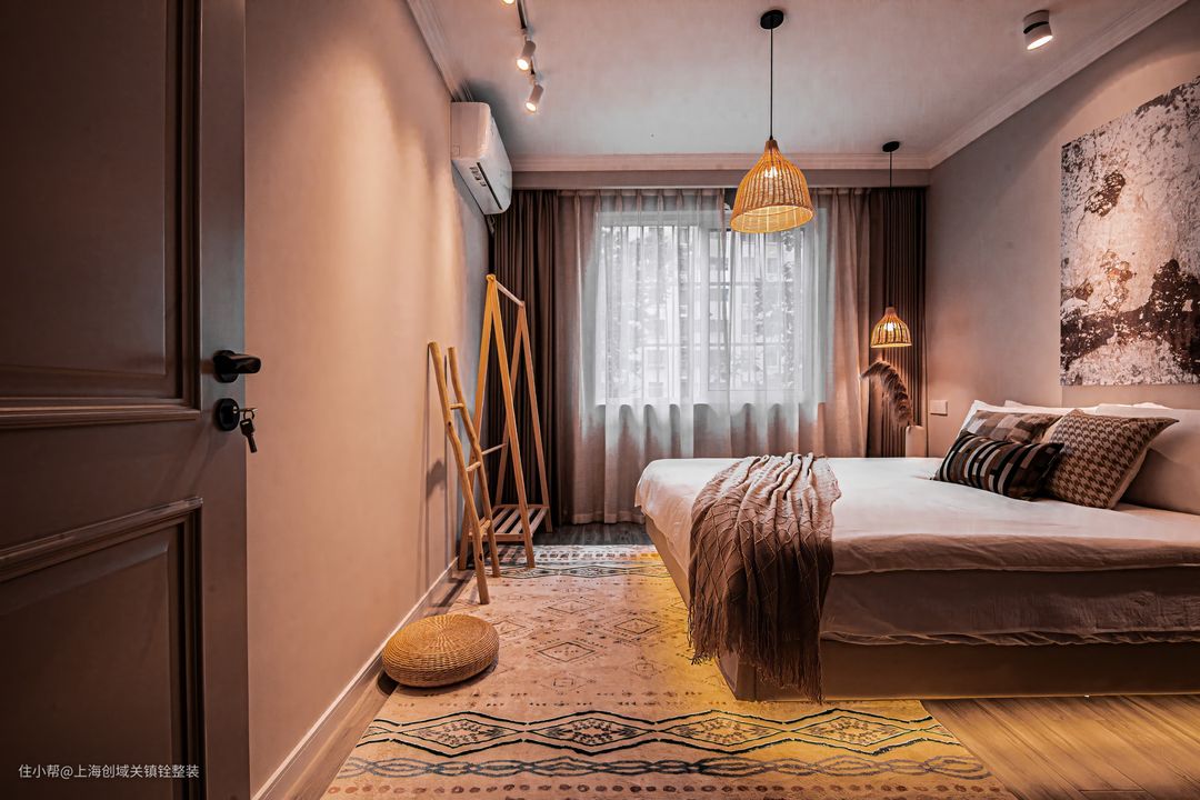 次卧简化北欧的奢美,使用森林藏物的设计思路,来换取更返璞、更归真的睡眠空间。境随本心,则是卧室设计的灵魂所在,对于有着超高品味的业主来说,当然愿意为了家居美学和极致的感官体验去寻找,去投资。 关于软装,我们几乎跑遍整个上海,只为了挑选一具床品、一组衣架、一幅挂画、一盏笼灯、一张地毯,甚至连窗帘的颜色,也经过多次明暗对比,才寻觅到最贴合空间调性的鹿褐色。空间整体以大量符号化的堆砌,以及规律性的留白给予视线缓冲的余地,空间情绪饱满而又分明,所谓以所有之物来打造心安之处。 关于结构,我们采用自然分割法:床铺居于中央,床面与窗户一面保持一致,便于自然光线流入以及空间流通;床尾处铺上波西米亚风地毯,高级感民族风情扑面而来;床头柜位于窗户边且避免挡光,增加收纳水平;在窗户对面处放置一张休闲椅,并且款式与床品的风格相呼应,周围再加入富有自然声量的木墩与枝干,敬畏时光日夜丈量的脚步痕迹,营造岁月往复沉淀的宽厚胸怀,也能彰显业主与世无争的生活态度。