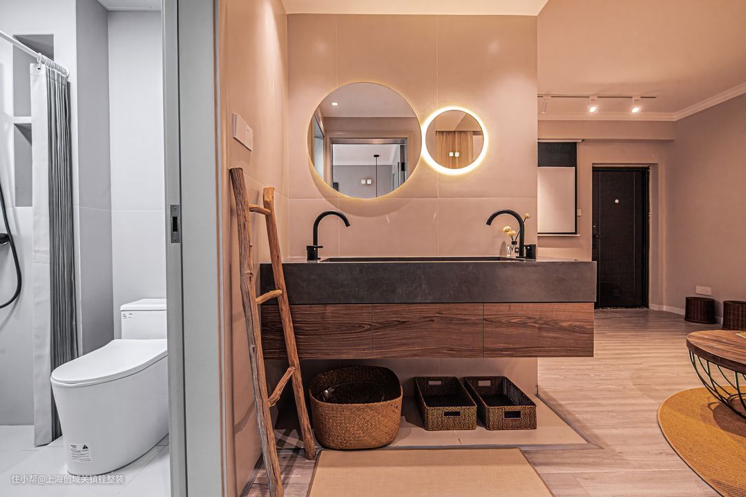 为了提升卫生间的干净整与使用效率,我们进行“三式分离”设计,将淋浴区、马桶区、洗手区相互分离,三大空间不重叠,保证各个区域的隔离性,并且可供三位家人同时使用互不干扰。 我们将洗手台置身在外,有利于家庭所有区域使用,产生“互补”的作用。洗手台底部镂空,不仅便于日常清扫,在视觉表现上也轻盈了不少。 造型表达方面,通过石材与木材的组合包裹,搭配珠圆玉润的明镜,更显质感温润有力,让此处不再是家中的某个角落,而是格外闲情逸致的装扮。 走入内部,采用浴帘和浴帘杆搭配组合的隔断形式,“能隐身也能现身”,拉起时充当两区之间的隔断,收缩后立马破除空间的封闭感,让卫生间重归一体,整体空间拥有较强的可塑性,满足一家人想要的空间效果和功能需求。 综上所述,我们通过合理的布局、简单素雅的材料、自然朴实的元素、便捷舒适的体验,这些设计原则的结合,使得卫生间兼具实用价值和美学价值,为业主创造出倍感贴心的使用感以及精神上的放松和解脱。