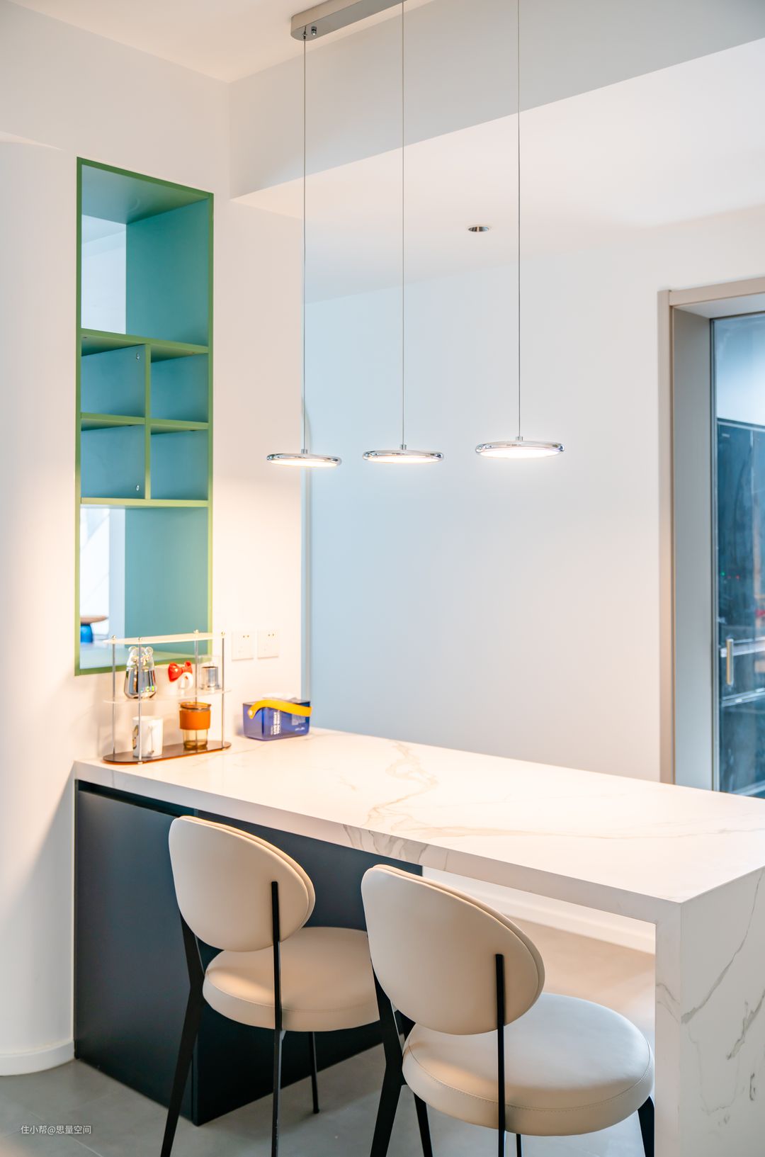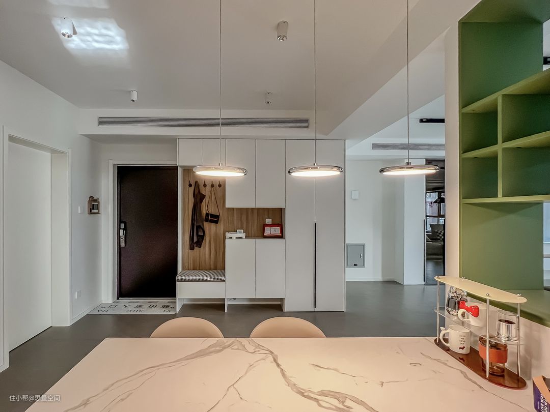 在厨房外设计了餐厅吧台,也可以做作为厨房的中岛吧台,增加了实用功能。一家人简单的早餐可以就近在这里就餐,而不需要到楼梯处的大餐桌处。大餐桌是家人聚会的空间。原来空间的小柱子,整体包裹起来并内嵌格架,作为餐边柜来使用。#记录我装修中的家 #餐厅 #简约 #拿捏宅家氛围感 #餐厅 #装修 在厨房外设计了餐厅吧台,也可以做作为厨房的中岛吧台,增加了实用功能。一家人简单的早餐可以就近在这里就餐,而不需要到楼梯处的大餐桌处。大餐桌是家人聚会的空间。原来空间的小柱子,整体包裹起来并内嵌格架,作为餐边柜来使用。#记录我装修中的家 #餐厅 #简约 #拿捏宅家氛围感 #餐厅 #装修 白色岩板吧台,干净美观好用。吊顶的三颗小吊灯,光线刚好打在吧台上,给就餐的灯光增加光线。这个空间利用率非常高,喝杯咖啡品一杯美酒,都可以增加氛围感。#吧台 #餐厅 #现代 #记录我装修中的家 #拿捏宅家氛围感 绿色可以是生命的象征,也是希望与繁衍的象征,希望这个家,每天都充满生机盎然的氛围,让每一天的幸福感增强,这就是设计师打造美好家的使命!#餐厅 #简约 #记录我装修中的家 #装修