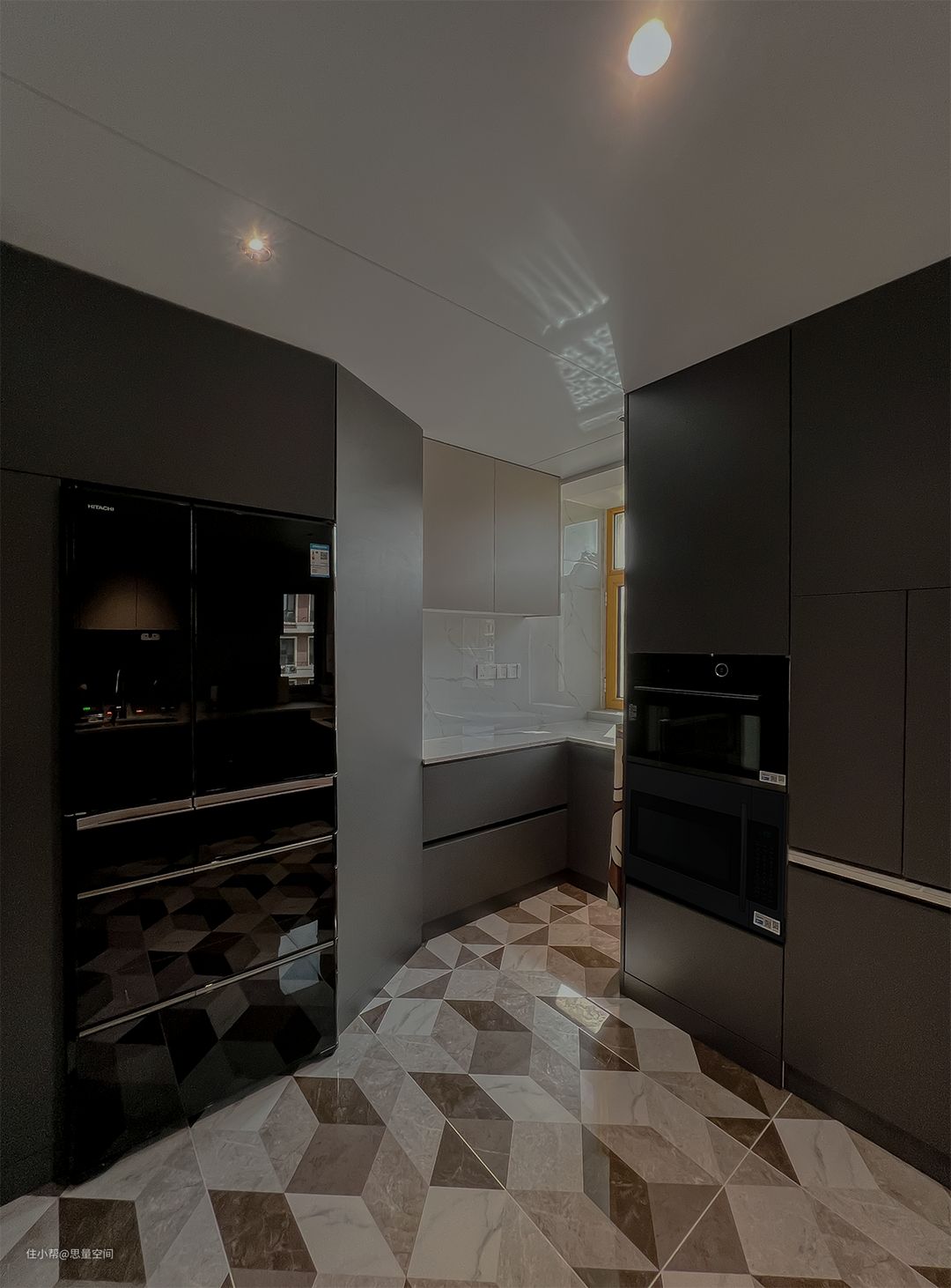时尚又摩登的厨房设计空间。将原来的卫生间和厨房合并后,现在的厨房空间非常宽敞。整体黑白灰色对比强烈,地面的几何拼配的花砖让空间充满层次感。吊顶采用了蜂窝大板,看上去更简约。高柜与地柜组合的形式,将电器全部内嵌进高柜,又增加了厨房储物功能,这样的橱柜设计好用又美观!#厨房 #记录我装修中的家 做硬装的时候顶面预留了暗装滑轨的轨道,后装玻璃推拉移门,如果空间够用,一定要装玻璃推拉移门,不占空间,美观又实用!