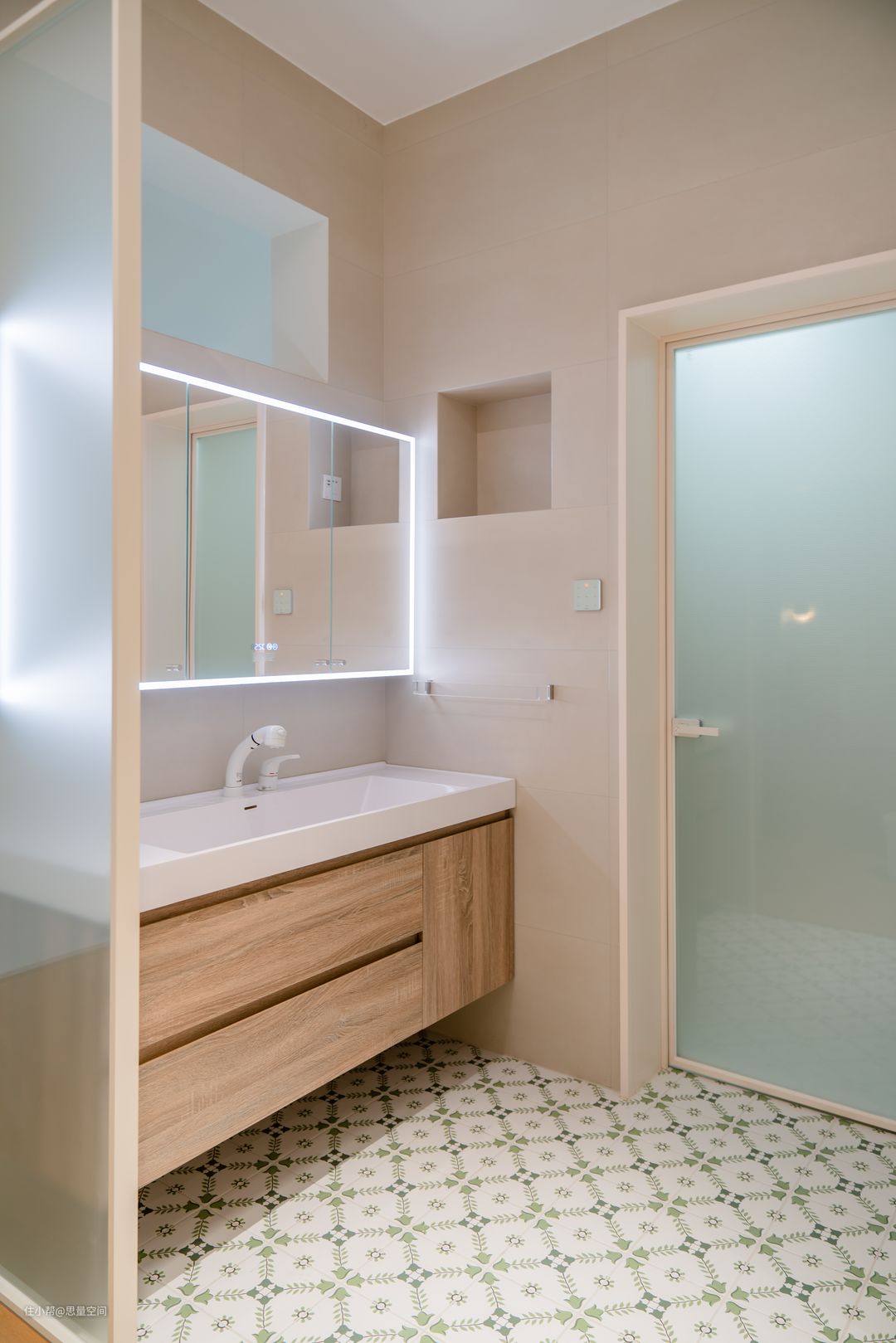 这是二楼的卫生间。二楼的楼梯改位置之后,原来的位置刚好作为二楼卫生间的空间。设计了三分离的卫浴,独立马桶间,独立淋浴间,独立洗漱空间。满足了多人使用卫浴的需求。#卫生间 #记录我装修中的家 #装修 #一人一个装修经验 #三分离 用一个玻璃隔断,分隔出卫浴空间.挂装的带灯带的镜子,很实用。地面的小花砖,很有层次感。 #卫生间 #干湿分区