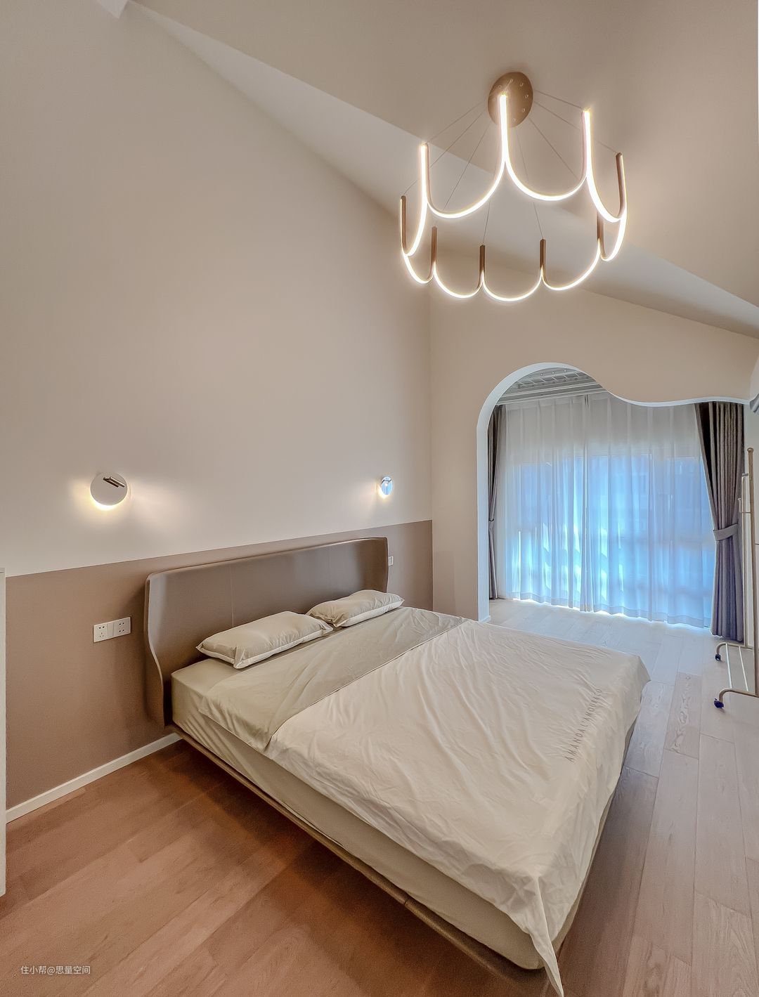 二楼的主卧室,有很高的挑空!最低点处也有3米多了!直接保留了原屋顶的斜面屋顶,空间更显宽敞明亮!阳台处的垛子设计成圆弧型状,增加空间的柔美性,也柔化了异形吊顶的压迫感!木质的地板与米白色的墙面,让空间更显温柔!#卧室 #记录我装修中的家 #简约 #现代 #拿捏宅家氛围感 #装修 #装修听我一句劝 #斜屋顶 纤薄的床背,与墙板融为一体!整个色调都是很温柔的素净的。卧室本就应该温柔安静。为了减少异形坡屋顶的造型,因此做了局部吊顶的设计,并内嵌了灯带,增加光晕带来的氛围感!内嵌壁橱的设计,让空间更有整体感。 壁橱衣柜选用了日式的推拉折叠移门,移门的价格并不便宜,但是里面做了金属挂件的衣架,造价节省,任意组合方便使用。综合来看还是很值得的。 为了满足女主人的需求,利用隔墙分割出衣帽间的空间。圆拱形的门洞,并不需要设置房门。内部一排衣柜装满空间,增加储物量。靠墙处的书桌,可以做为化妆桌使用,功能性也非常齐全。 墙面圆形的小壁灯,即是装饰也是照明灯,实用且美观!卡其色的配色,让卧室空间更显温柔!午后阳光照射进来,光线温和而柔美! #卧室 #壁灯