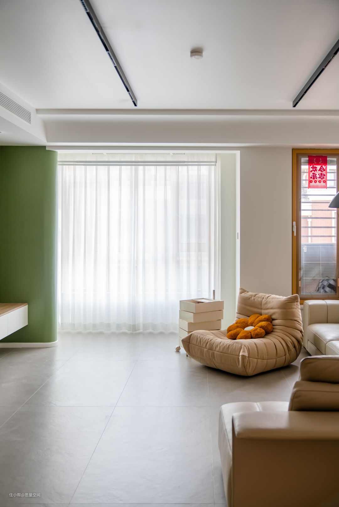 客厅的灯光设计用了轨道明装射灯,就是当下比较流行的无主灯的设计。客厅沙发居于起居室中心,环绕式使空间动线流畅。顶面内嵌中央空调,利用原有空间的梁设计成半弧形的吊顶造型,以及阳台柱子的圆弧形造型,使空间整体柔和。影视墙点缀了一抹绿色,跳跃的色彩让空间更显生动活泼。 客厅地面选用的是600*1200的灰色素色哑光砖,哑光砖会让空间更显品质感。整铺瓷砖让空间更素净。原楼梯位置移到靠墙一侧,顶面坡屋顶做挑空,空间变得更宽敞。 从窗户这一边望向餐客厅空间,空间宽敞明亮。 阳台与影视墙过度的地方,做了圆弧形的墙体,让空间过度自然。一抹绿色,让空间更显活泼与层次感!