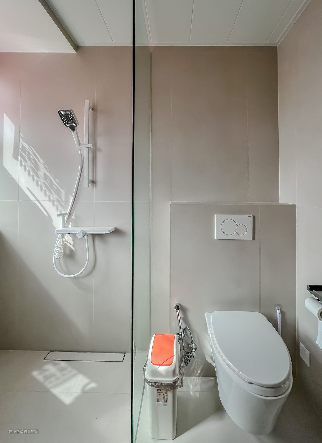 奶油灰素色通铺,卫生间也可以装的这么美!【素色大板瓷砖通铺】600*1200的瓷砖,竖向通铺,奶油灰色的纯色系,让空间显得干净整洁,相信我卫生间必选哑光砖,装完就能感受到空间有多高级了!#卫生间 #记录我装修中的家 #一人一个装修经验 #装修 #装修听我一句劝 【隐形内嵌地漏设计】 传统地砖的做法:这里想说,不要300*300小砖找坡度返水,不要地漏内八字切瓷砖安装地漏,真的太丑啦!听我的就这么设计:1.做下水的时候把下水管做在墙边沿或者角落里,2.地面通铺和墙面同尺寸的大砖,整体找坡度到地漏。3.安装内嵌同色瓷砖的隐形加长地漏。装完后的效果看上图,简直不要太完美!#卫生间 #地漏 #装修 #一人一个装修经验 #装修听我一句劝 【玻璃隔断代替淋浴屏】现在的设计师就是特别会偷懒,能舍弃的就舍弃,我就觉得淋浴屏没啥必要,一个玻璃隔断直接解决挡水问题,地面水会按照坡度自然回流到地漏,也不会到处乱飞,空间也会更流通更宽敞,还节省了一大半的开支💰何乐而不为咋!#卫生间 #装修 #一人一个装修经验 #玻璃 #淋浴屏 【瓷砖做壁龛】有一些包管的位置,顺便可以设计一些小壁龛,放东西特别实用,就不需要再去购买五金挂件了!#壁龛 #卫生间 #记录我装修中的家 #一人一个装修经验 #装修 卫生间干湿分区,干区设置洗手盆与功能柜。功能柜内部的隔板与洞洞板增加功能性。窄边框的长宏玻璃,造型极简又美观。#卫生间 #干湿分区 #记录我装修中的家 #一人一个装修经验 #装修 #装修听我一句劝