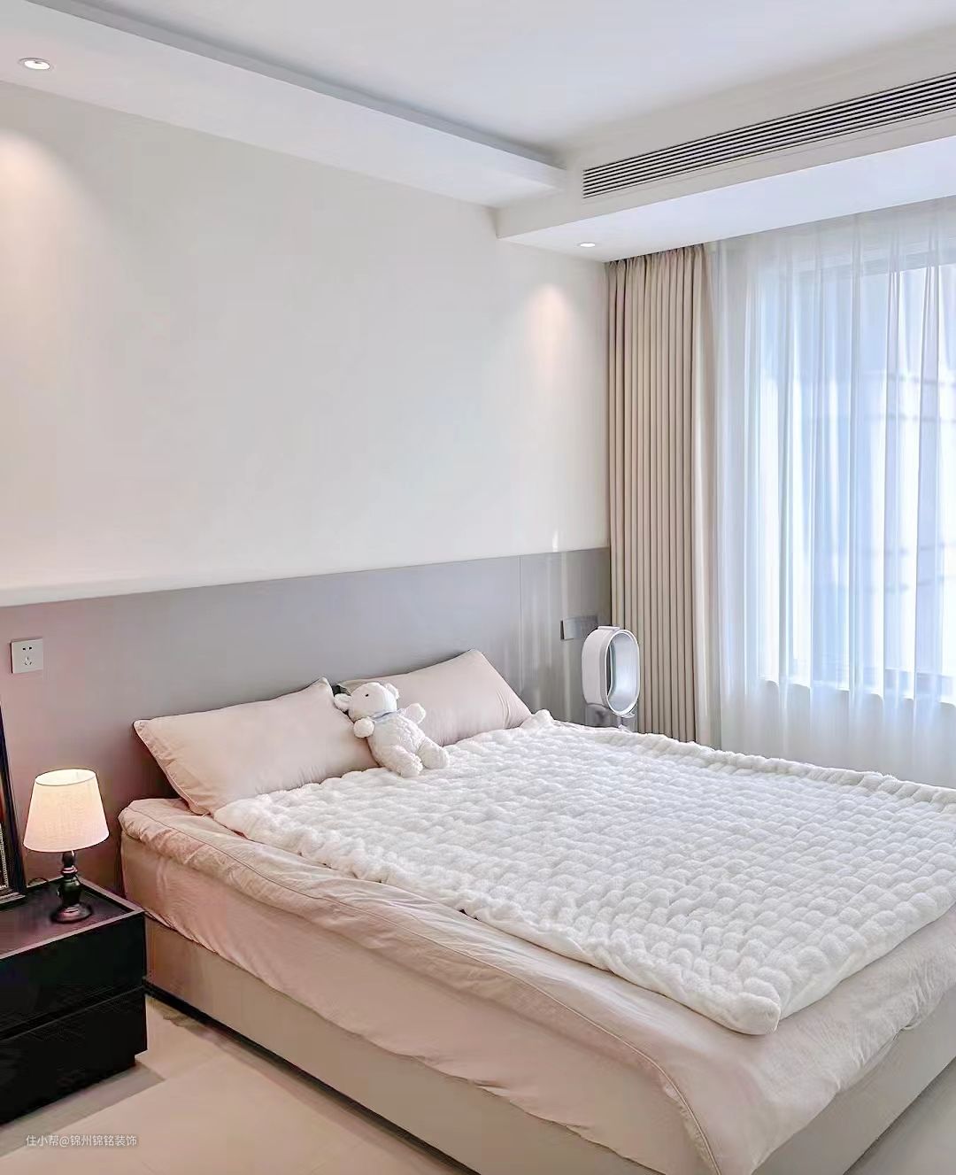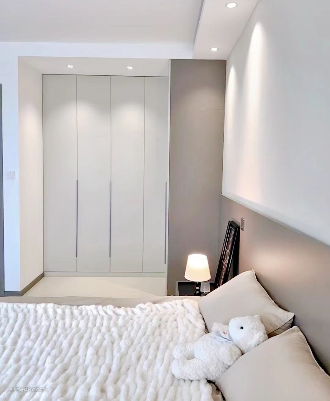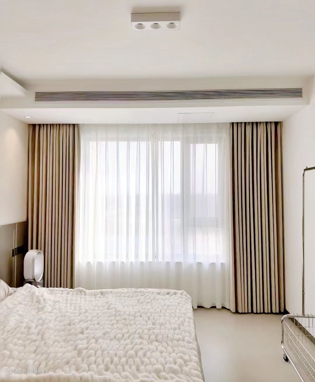 主卧衣柜,极简一字,金属柜护墙板主打暗灰白色系。床头墙刷了淡淡的暖色其他墙面刷白色乳胶漆。窗帘预留双层轨道,窗帘盒木工阶段预留30cm工艺选择韩式褶皱+高温定型,床头射灯避开床头位置一侧做隐光增加氛围感,最后搭配小家电家具房间还是很温馨的。