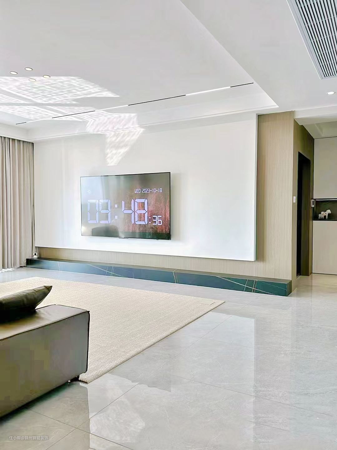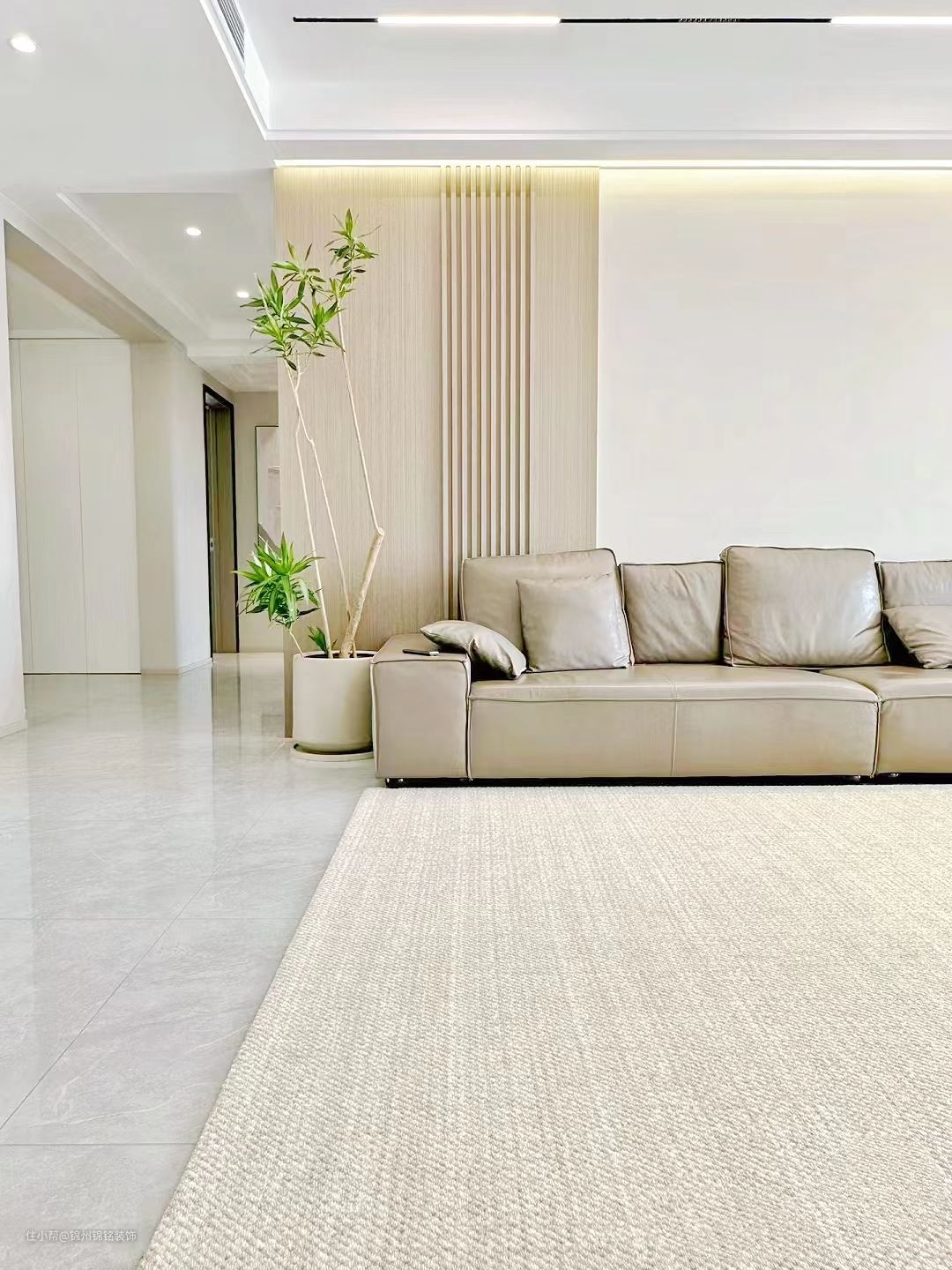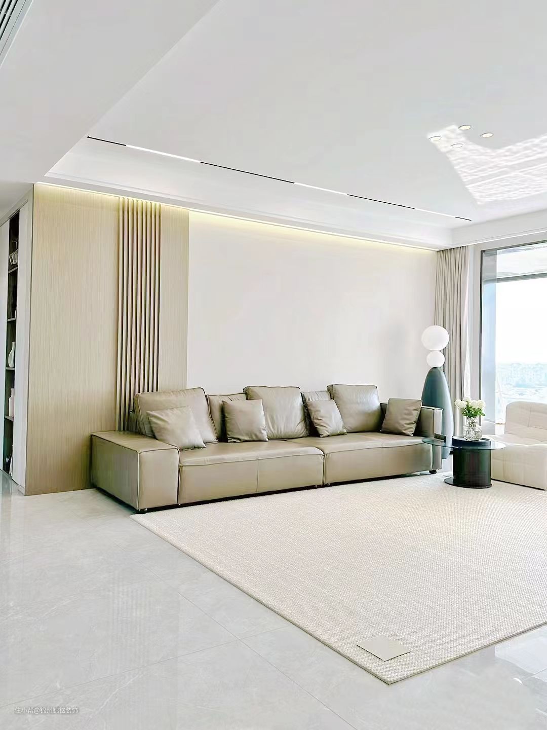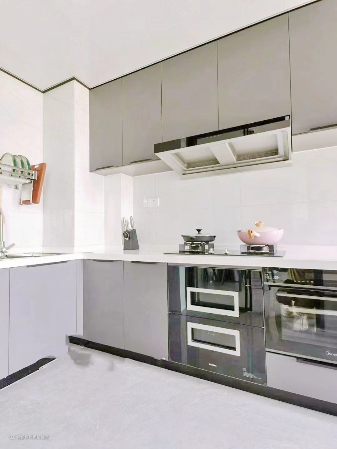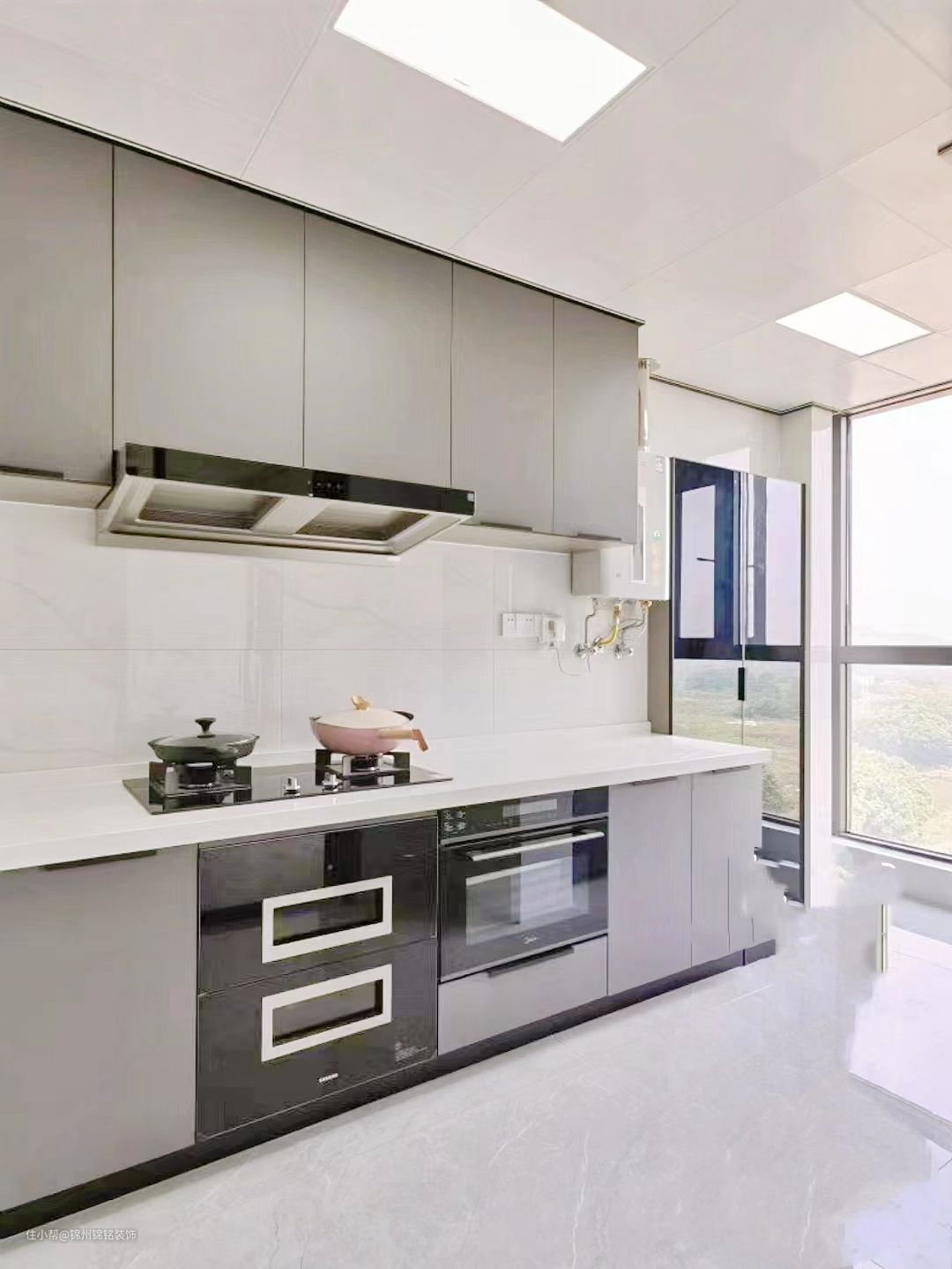 柜门pet(LG),深碳灰,柜体是实木多层。台面,2厘米厚度,纯白石英石。吊顶,30*60铝扣板,哑光纯白。吊轨移门,透玻,方便打扫卫生。地砖,客厅通铺75*150浅灰,墙砖40*80。黑玻收纳柜,原本是安全通道门,做了嵌入式收纳柜。