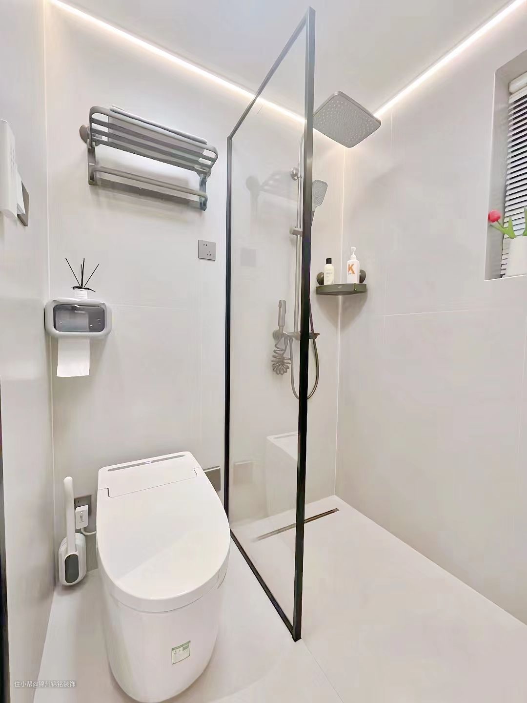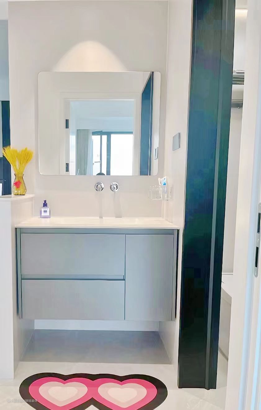 果断砸了做半墙干湿三分离卫生间,保留了一半墙体,挡住浴室柜侧面板,美观性更好也避免洗漱时溅出来的水从侧面流到地面。半墙总高度1.1米,比洗漱台安装高度高25cm,小物品完全可以遮挡,不会显得杂乱无章。 台面用的是鱼肚白岩板,搭配陶瓷台下盆,做的无缝衔接工艺,无后挡水设计,浴室柜下水选择墙排,不选地排,美观的同时无卫生死角,洗脱机器人可自由进出。