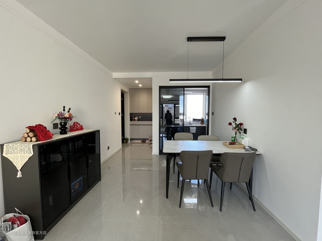 餐厅独立设置一个空间,靠墙摆放四人位餐桌,满足日常需求。另一侧摆放成品矮柜,增加餐厅的收纳空间,上方长型吊灯设计,增加就餐气氛感。餐桌上方设置插座,方便聚会时,吃火锅和烤肉。