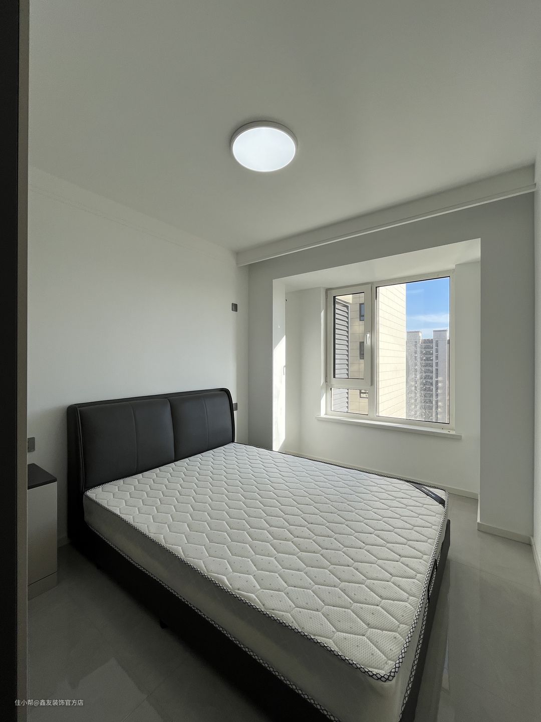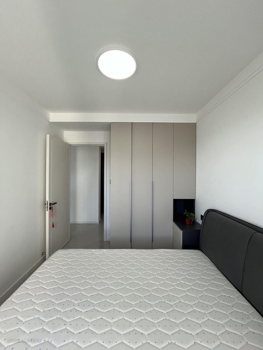 次卧与主卧相同,简单的摆放一张双人床,定制柜子延伸出来一个小柜子,上方可以摆放一些小物品,通顶衣柜,可以满足业主收纳需求。墙上方按照插座,方便以后按照空调。