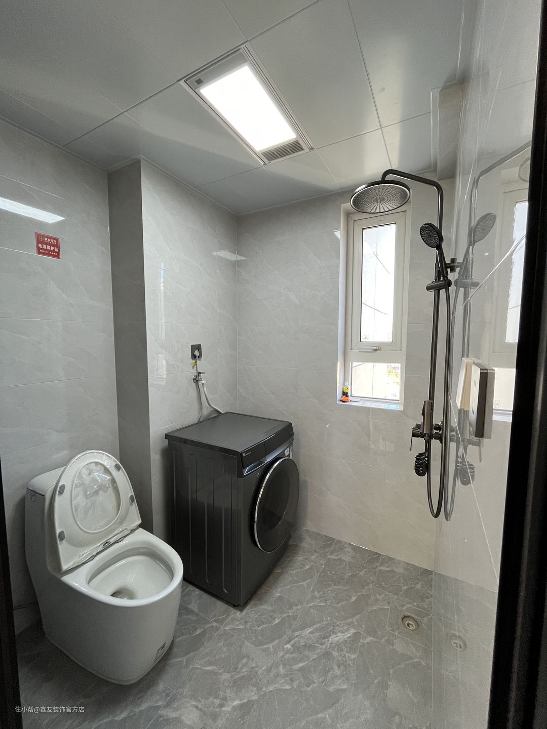 卫生间将洗手盆外置,形成干湿分离,上方镜柜和下方吊柜满足收纳洗漱用品需求,卫生间门采用黑色磨砂玻璃门,可以很好的保证隐私,将洗衣机纳入洗澡间,换洗的衣服可以直接放进洗衣机里,卫生间有一扇小窗户,洗完澡可以开窗通风,使地面更快干,保证空间的透风与清爽。