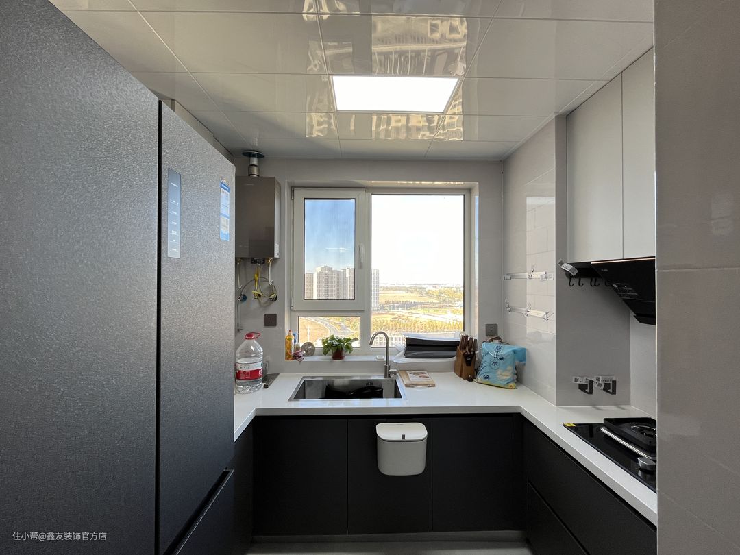 厨房下方橱柜使用深色系,耐脏好打理,上方使用浅色系,增加空间的亮度。