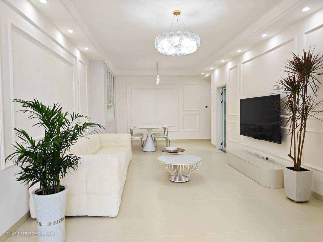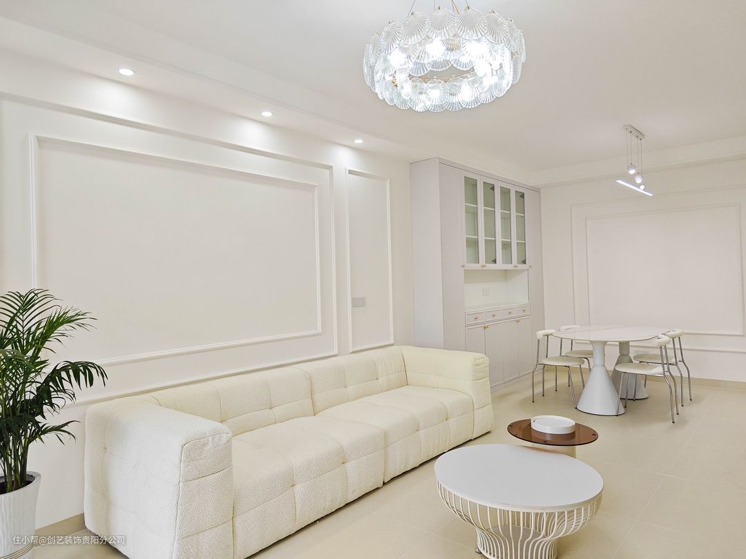 🌷 全屋通刷白色乳胶漆 白色真的yyds,后期软装不管怎么选颜色都好搭配。 🌷 全屋通铺哑光瓷砖 很多人都以为地面是微水泥,其实就是哑光瓷砖搭配环氧彩砂。 🌷 放置矮小茶几 小而精的茶几真的很适合有孩子的家庭,有更多的空间适合孩子玩,也不怕被茶几磕到碰到。 🌷 石膏线&护墙板💯组合 沙发墙&电视墙虽然大面积留白,但在护墙板&石膏线的设计组合下,层次丰富,颜值照样能打。