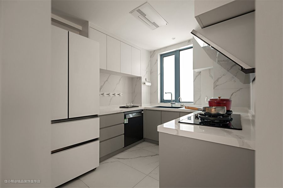 玄关后是厨房空间,室内以切角的进入,将空间利用率最大化,以大理石岩板为界,上方储物白色调,下方是灰色调,空间形成了层次的分隔。橱柜是上下柜设计,加上U字形的形状设计,储物问题轻松解决;进门时烹饪空间,后方是冰箱区域,切配区和洗菜区,合理的空间动线造就了烹饪美食的最佳地方,感受美食的香味飘散~