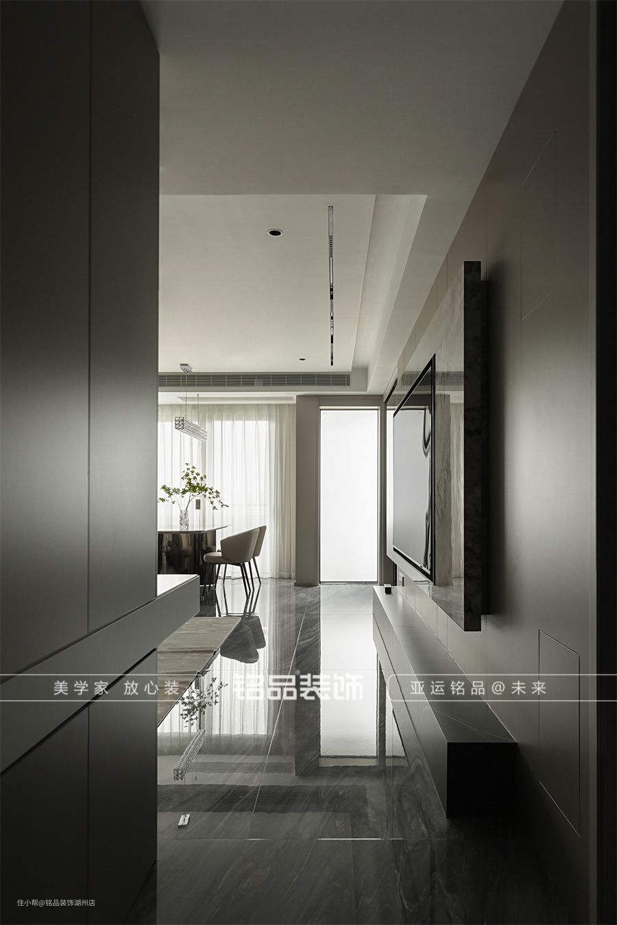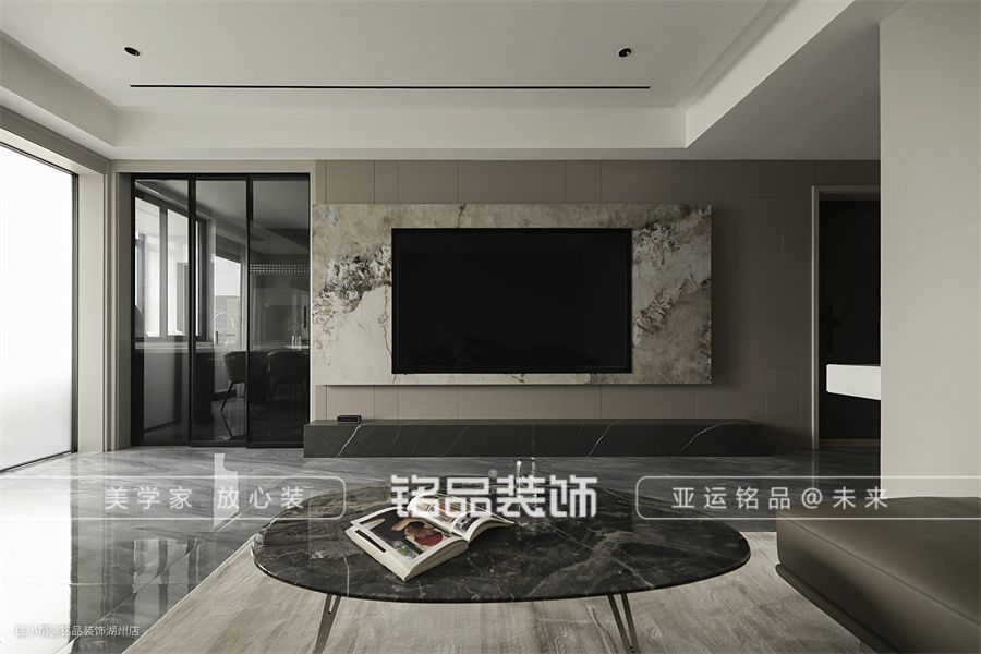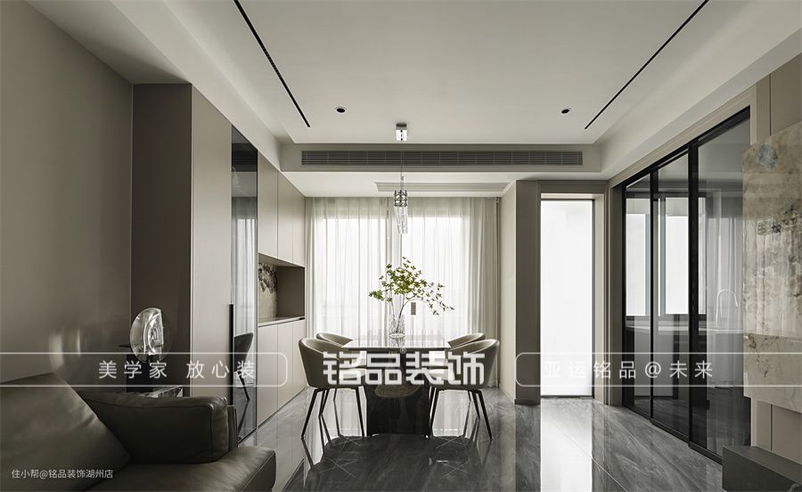 客餐厅地面通铺750*1500大砖,整体感更强。客厅c位是来自意大利的家具奢牌natuzzi沙发,在上面葛优瘫,想想就舒服。电视背景墙由整块的岩板切割而成,潘多拉的花纹丰富多彩的同时,又兼具着低调和奢华。 客餐厅是一体化的设计,餐厅放在了靠近阳台处,采光和动线都是最佳选择。餐边柜是公区的唯一收纳,留出台面、装饰柜和收纳柜储存各类物品。