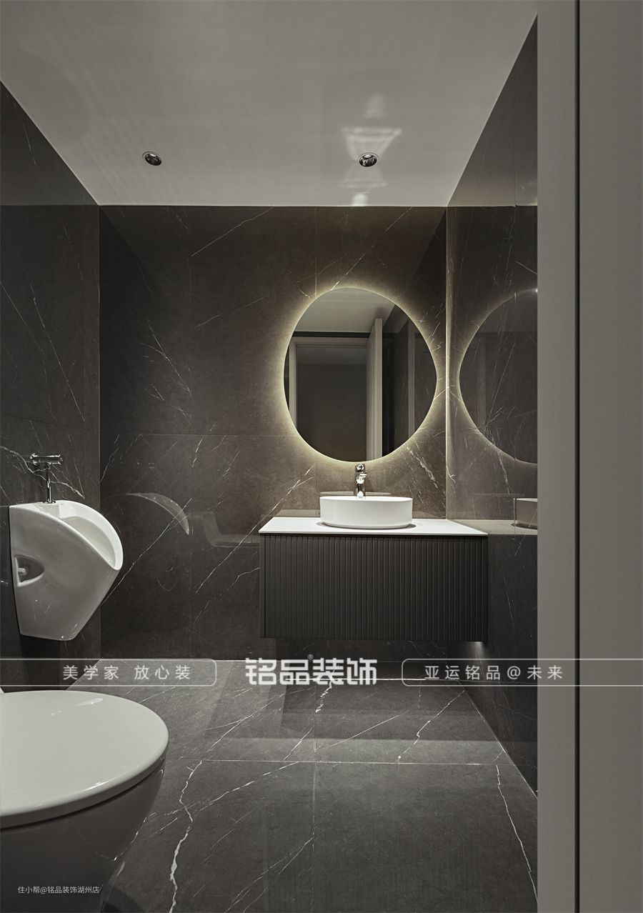 卫生间整体以灰黑色为主调,营造一个简约率性的卫浴空间,悬浮台盆+台上盆的设计,兼具美感,镜子上墙,周边搭配灯带做隐藏式光源,增加氛围感。次卫还安排了小便池,更注重卫生哦。 主卫墙地砖用了白色系的赌白纹大理石地砖,很明亮。台盆柜做了加上设计,留出更多置物台面收纳。淋浴房做了玻璃房,打造干湿分离的效果。