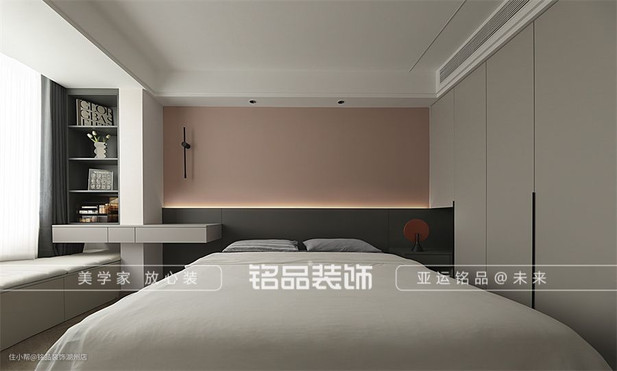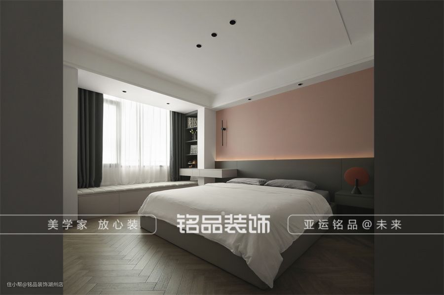 主卧格局经过调整后,形成了完整的套房结构,分别是睡眠区、书房、卫生间。 人字纹的地板,为卧室铺陈出温馨的底色。在白色围绕的墙面,莫兰迪粉的背景格外显眼,在寒冷的秋冬季节,平贴几分暖意。屋主夫妇比较时尚,欣然接受了去掉床头靠背的方式,而用半墙隔断+氛围灯的组合替代,个性十足。床侧是衣柜区,定制通顶柜满足日常衣物收纳。 屋主希望在保留卧室的同时还能拥有一个独立书房,主卧空间进深较长,将书房直接安排在了卧室里,既满足屋主的需求,又实现了功能的柔和。 卧室和书房之间有一堵隔墙,隔墙侧用了一扇长虹玻璃做隔断,实现功能区域划分独立。