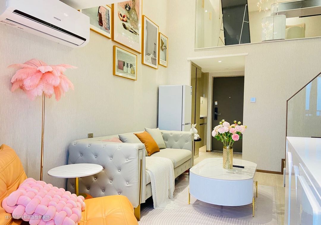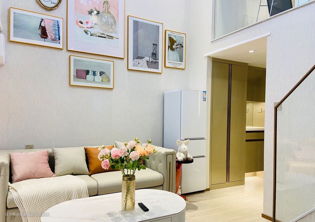 入户做了定制三分离玄关柜,中间和下面留空,加灯带设计,满足日常需求。沙发背景墙做了照片墙式挂画,提升艺术氛围。