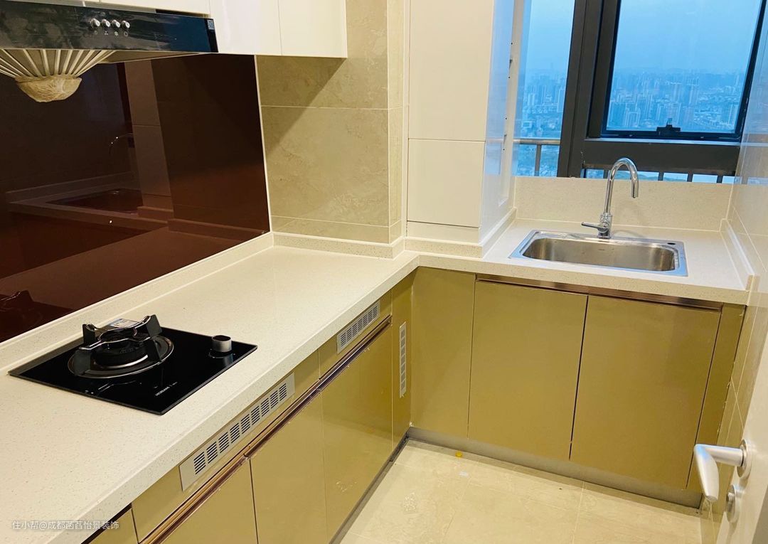 厨房做的L型操作台,动线流畅。吊柜和地柜都做,增加收纳。