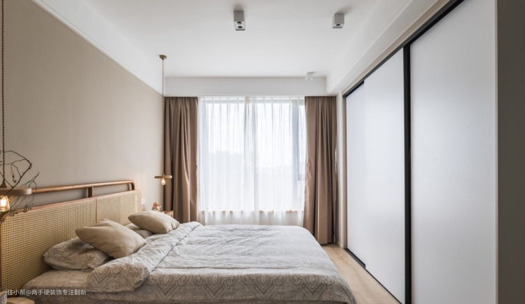 卧室保持与木色接近的色调统一,暖咖色的墙面与藤编点缀的床赋予空间与自然的衔接。
