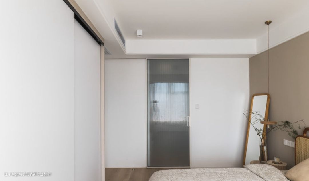 次卧的进门与电视背景墙相连,用隐形门的方式增加空间一体感。长阳台一分为二,让次卧也能拥有休闲阳台。