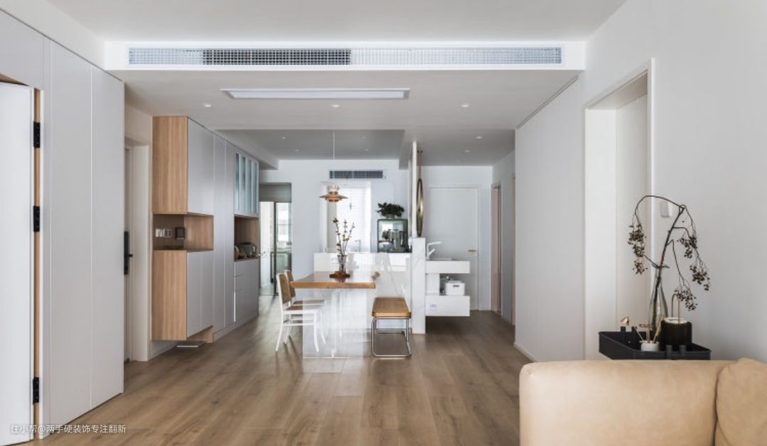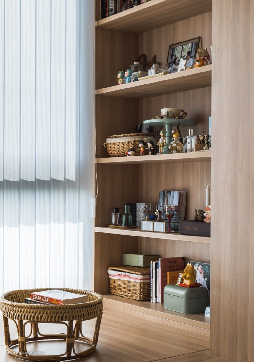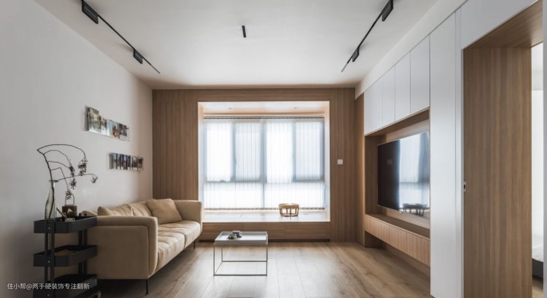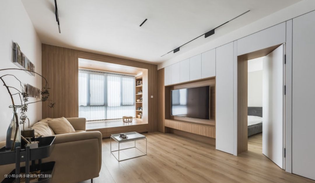 沙发背景的留白,是屋主可以自主diy的照片墙区域,而电视背景则用白色木色的柜门板做层次,避免木色过多带来的视觉平庸。