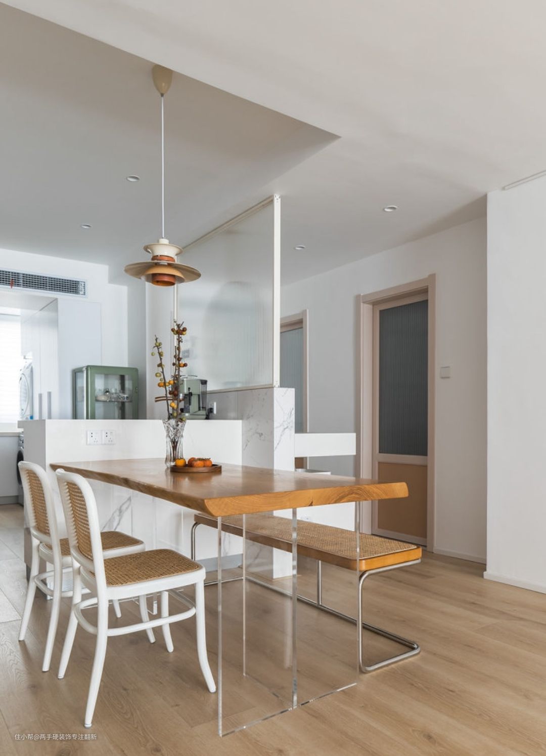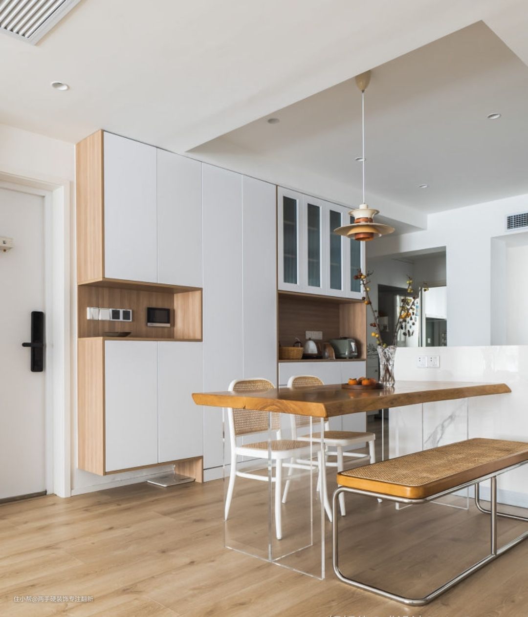 餐厅以岛台+餐桌的方式组合而成,岛台离餐边柜更近,也更方便一些小家电的使用,人数较少时的用餐也可以在吧台解决。