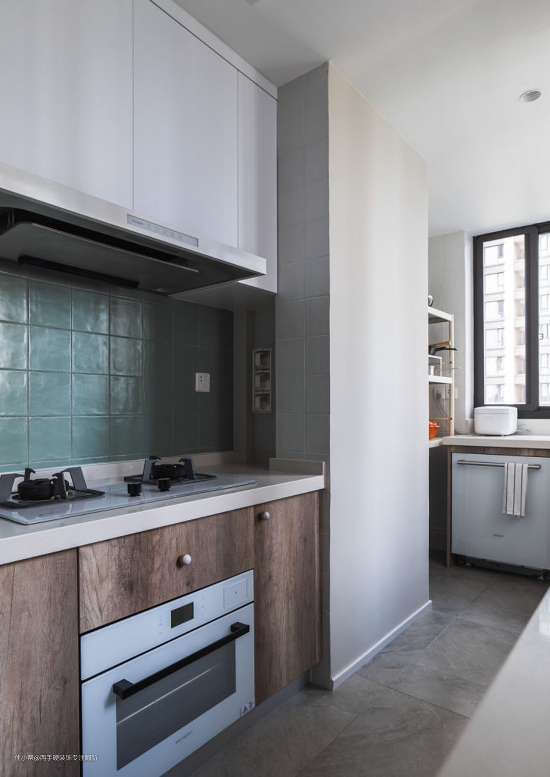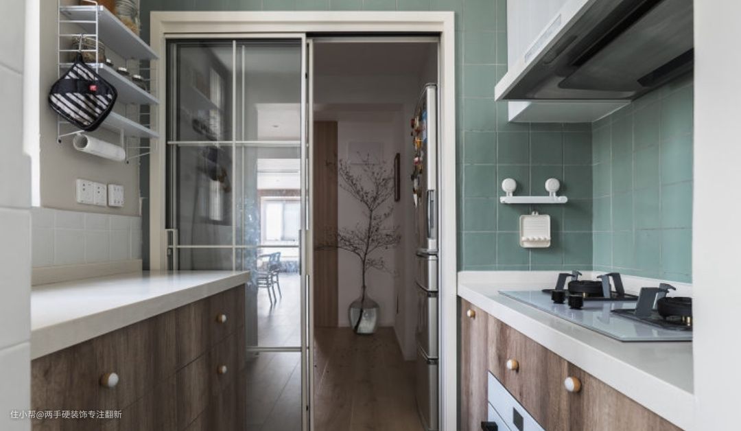 厨房的配色以偏深一点的颜色为主,便于日常打理,豆绿色的小方砖为空间增添一抹色彩。