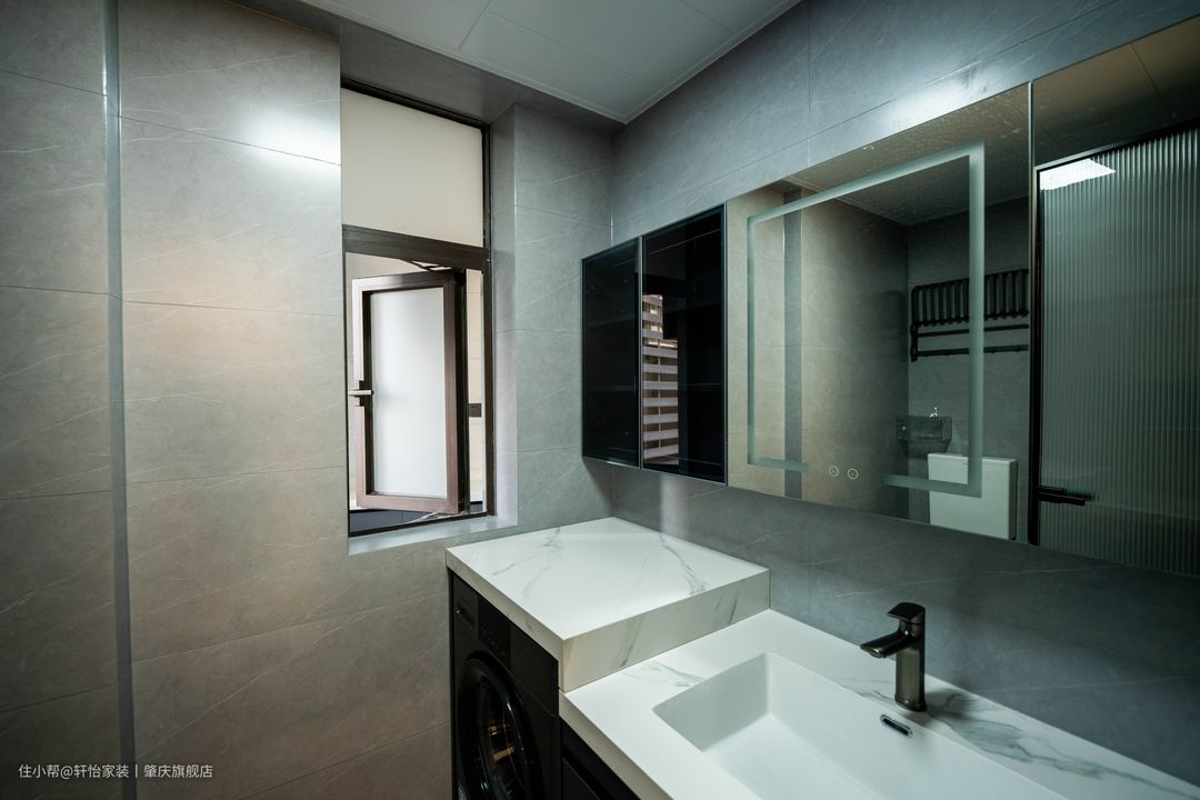 大理石台面洗手盆,台面抬高的设计合理的嵌入洗衣机,为浴室添加沉稳基调,让品质和理性在空间迸发。加长的镜柜可以收纳洗漱用品和生活用品让空间整洁不凌乱,中间的镜面做了LED灯不仅提升卫生间颜值,装扮时还可以提供充足的光源。 以黑色边框的玻璃拉门为界,做了干湿分离处理,方便日常清洁。多功能花洒套装换新淋浴体验。