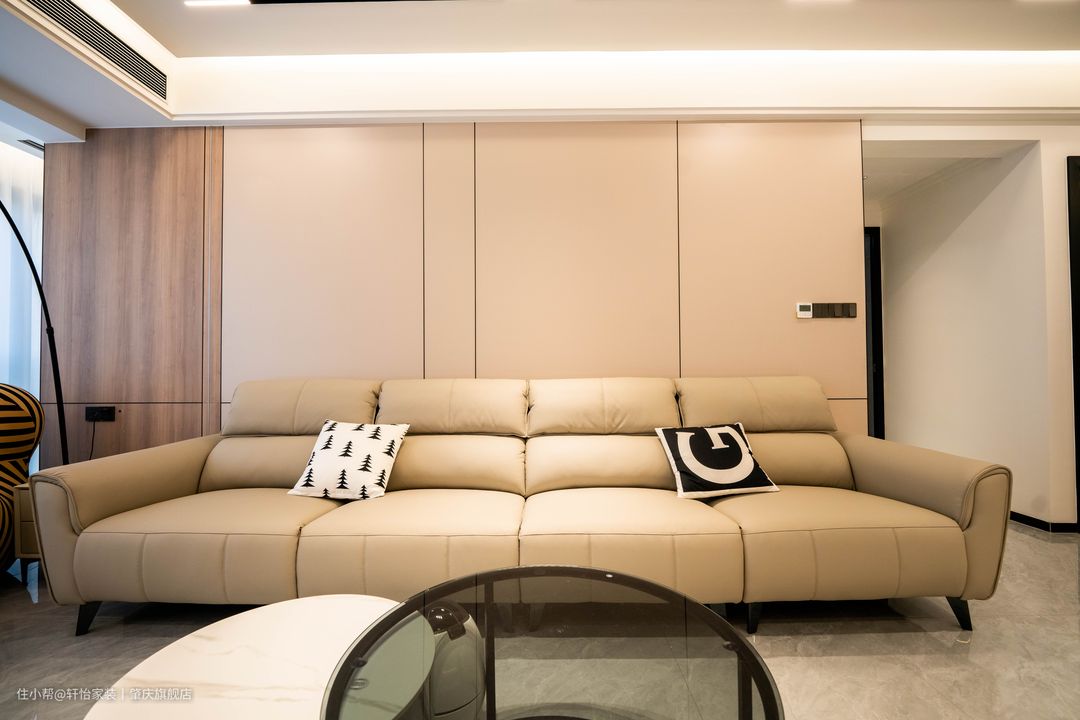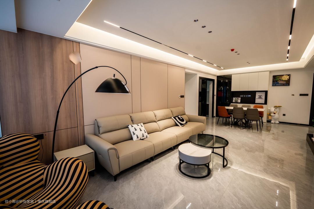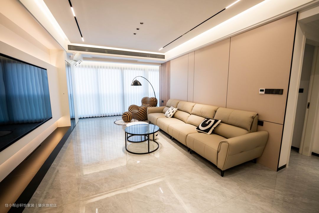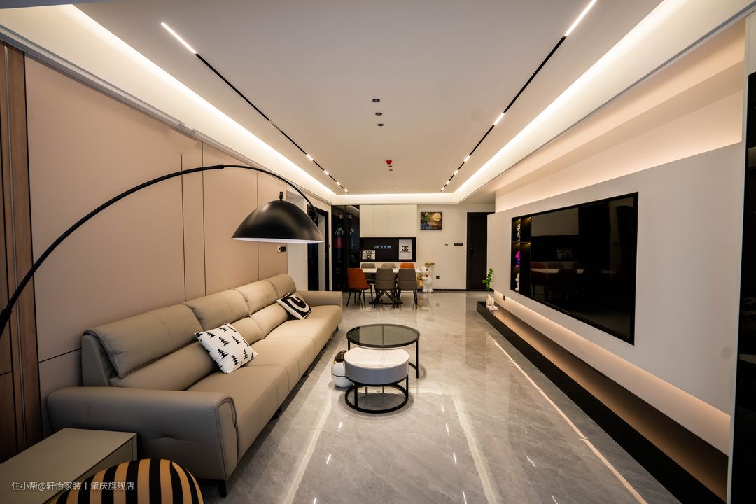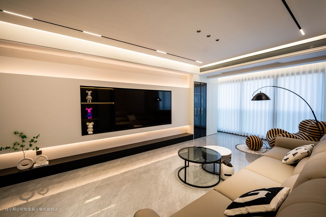 悬浮吊顶从客厅延伸到餐厅,让两个空间分而不隔断,吊顶四周以灯带围绕一圈, 隐藏式轨道灯和中间的筒灯作为空间的主要来源,无主灯的设计更显简约美。 简单的墙面用黑色线条做修饰,让空间更有线条立体感,左边改用实木板更加有特色。 同色系皮质沙发,触之细腻,观之气质!黑白跳色抱枕跟茶几的配色一致,小细节凸显生活品质。 背景墙选用简单的大白墙,上下不到顶的处理减少了白墙的压抑感,内置平行灯带更有氛围感。 在电视旁做了黑色开放柜,摆上不同色系的暴力熊摆件,减少了百墙的空白感,底下的绿植在大白墙的衬托下更显生机动人。 在阳台处放置了一个懒人沙发,跳跳虎的配色+圆球型的脚凳有种俏皮的感觉。黑色的钓鱼落地灯,让空间更有立体感。